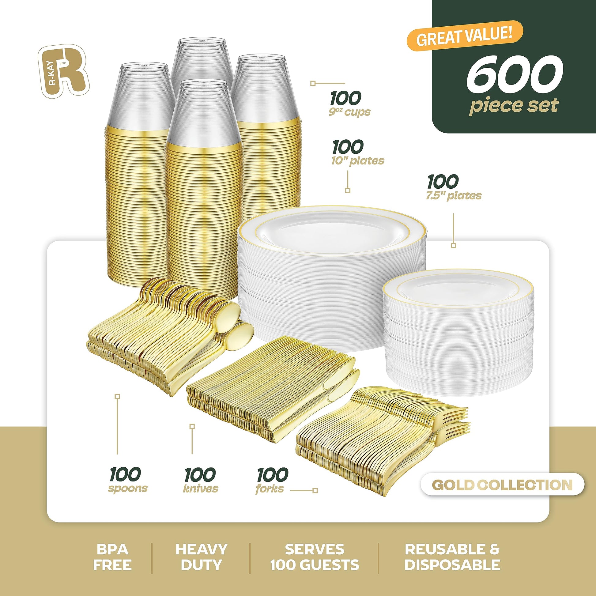 - ALL INCLUDED: Our 600 pcs disposable dinnerware set 100 guests has it all! it includes 10 In gold plates, 7 In wedding cake plates, 9 oz gold plastic cups And 100 Gold forks knives and spoons, this wedding plates disposable set has you covered for every course of the meal.