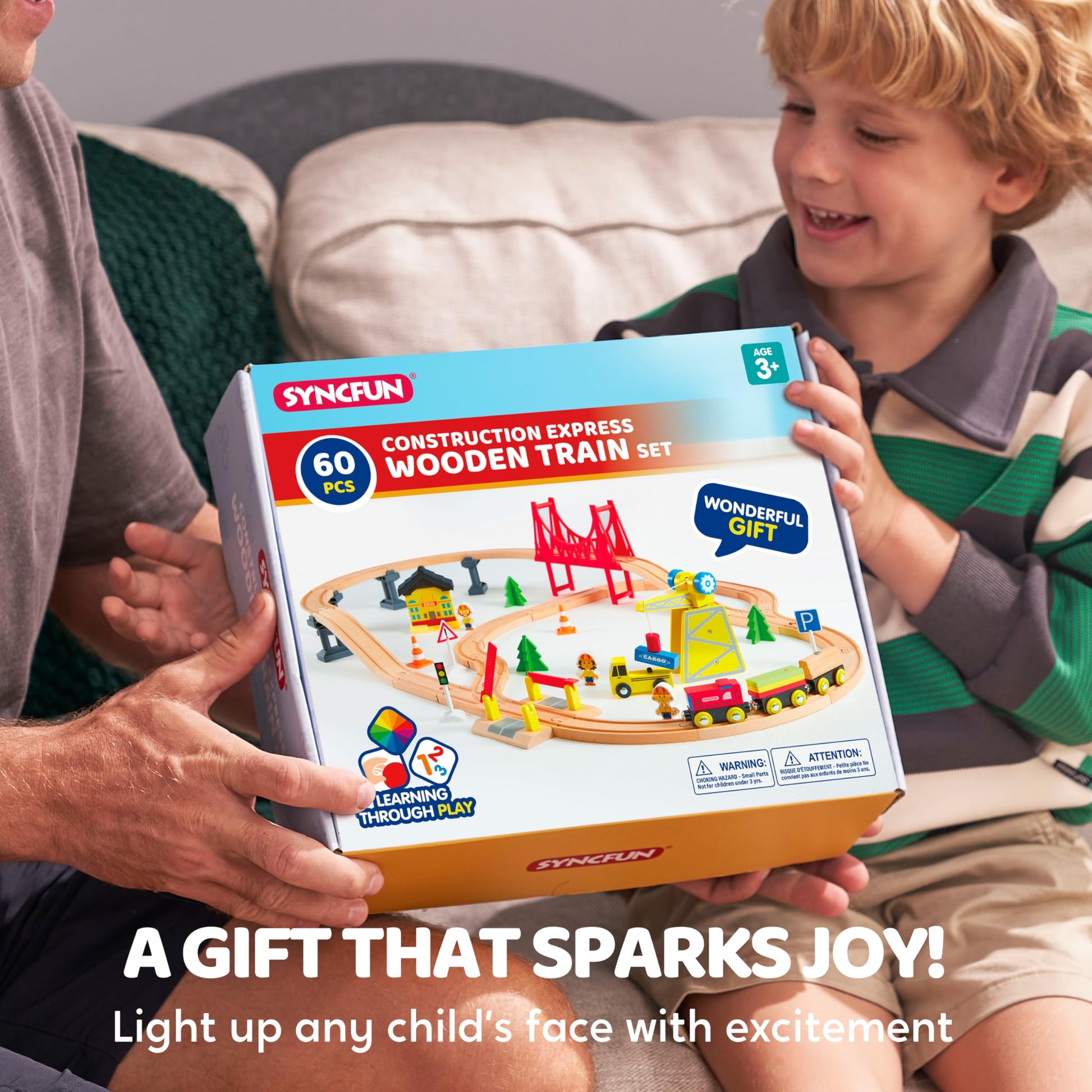 60PCS Wooden Train Set - Construction Express, Engineering Railway with Magnetic Crane, Trains & Accessories, Perfect Christmas Birthday Party Toy Gift for Kids Toddlers Boys Girls Ages 2-8
