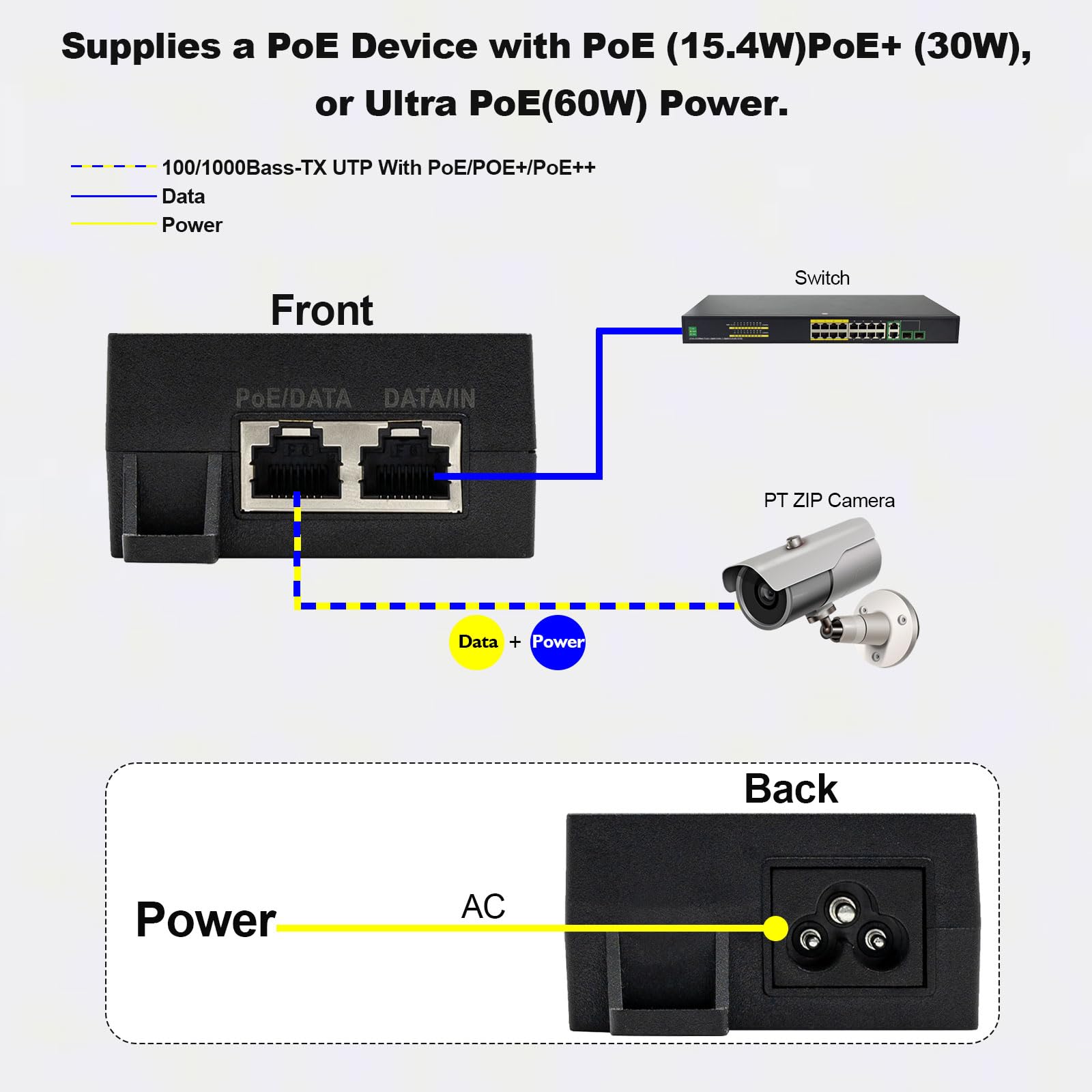 - Compatible with Various Devices: The unit is designed to work with both 802.3af PoE (15.4W) and 802.3at PoE+ (30W) devices, and offers backwards compatibility for passive PoE devices. It can deliver up to 802.3bt 60W to PoE++ devices