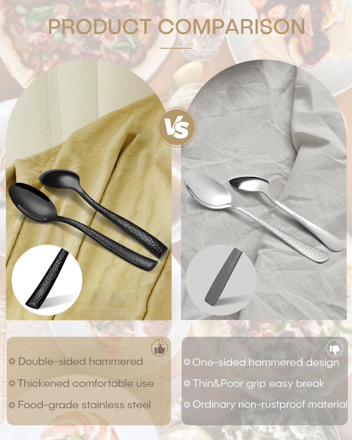 - Hammered Silverware Set For 12: Total 65pcs Black Silverware Set include 12x dinner forks, 12x salad forks, 12x dinner spoons, 12x dessert spoons, 12x dinner knives. Extra matching 5-piece black serving set, 1x serving spoon, 1x slotted serving spoon, 1x serving fork, 1x sugar spoon and 1x butter knife. Perfect for any occasion, such as daily use, family dinners, party, or formal events
