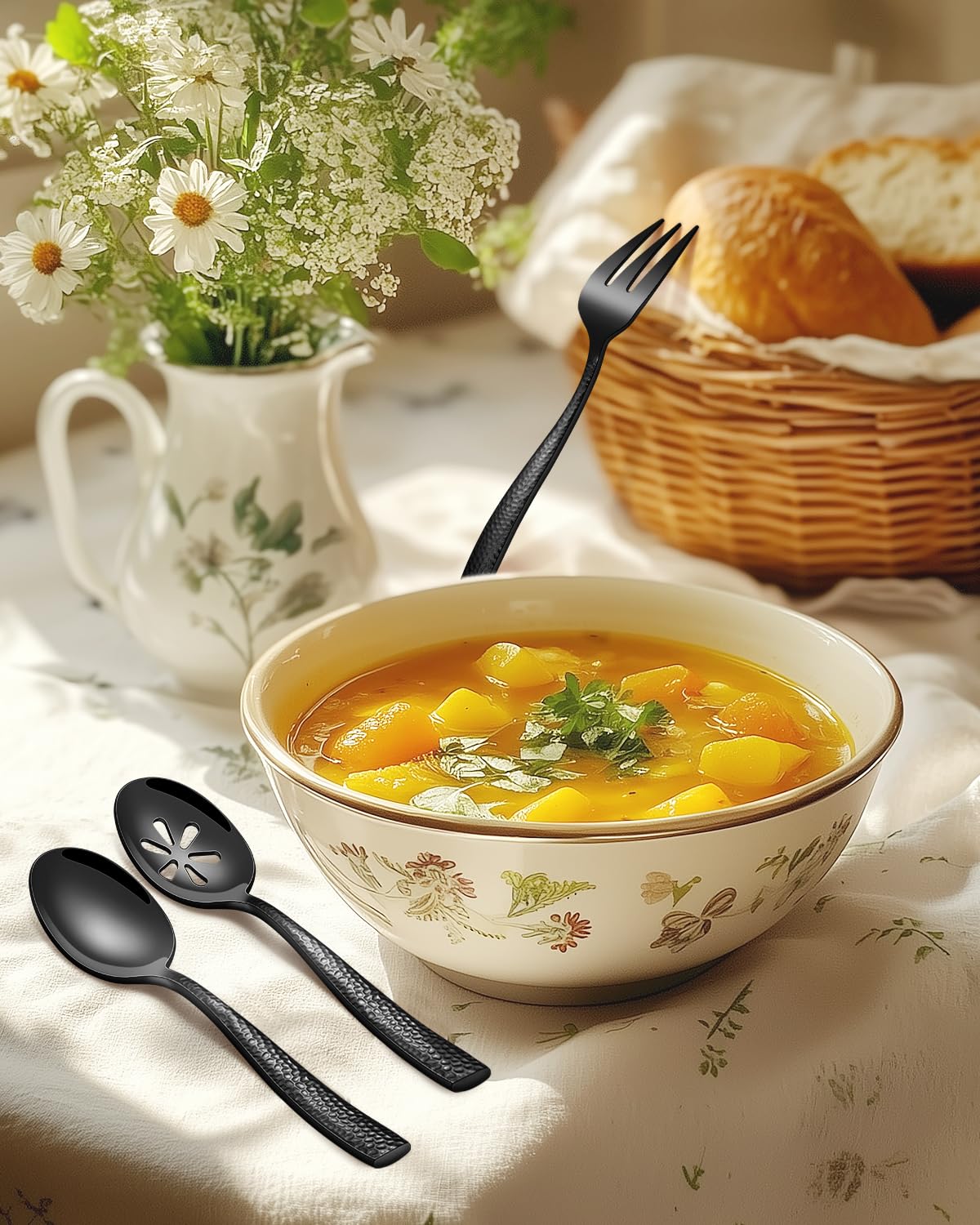 - OLLEX Support: If you have any questions about our Hammered Silverware Set with serving pieces, please contact us anytime, and we will provide timely assistance in resolving. Elevate your dining experience and create lasting memories with this black silverware set for 12