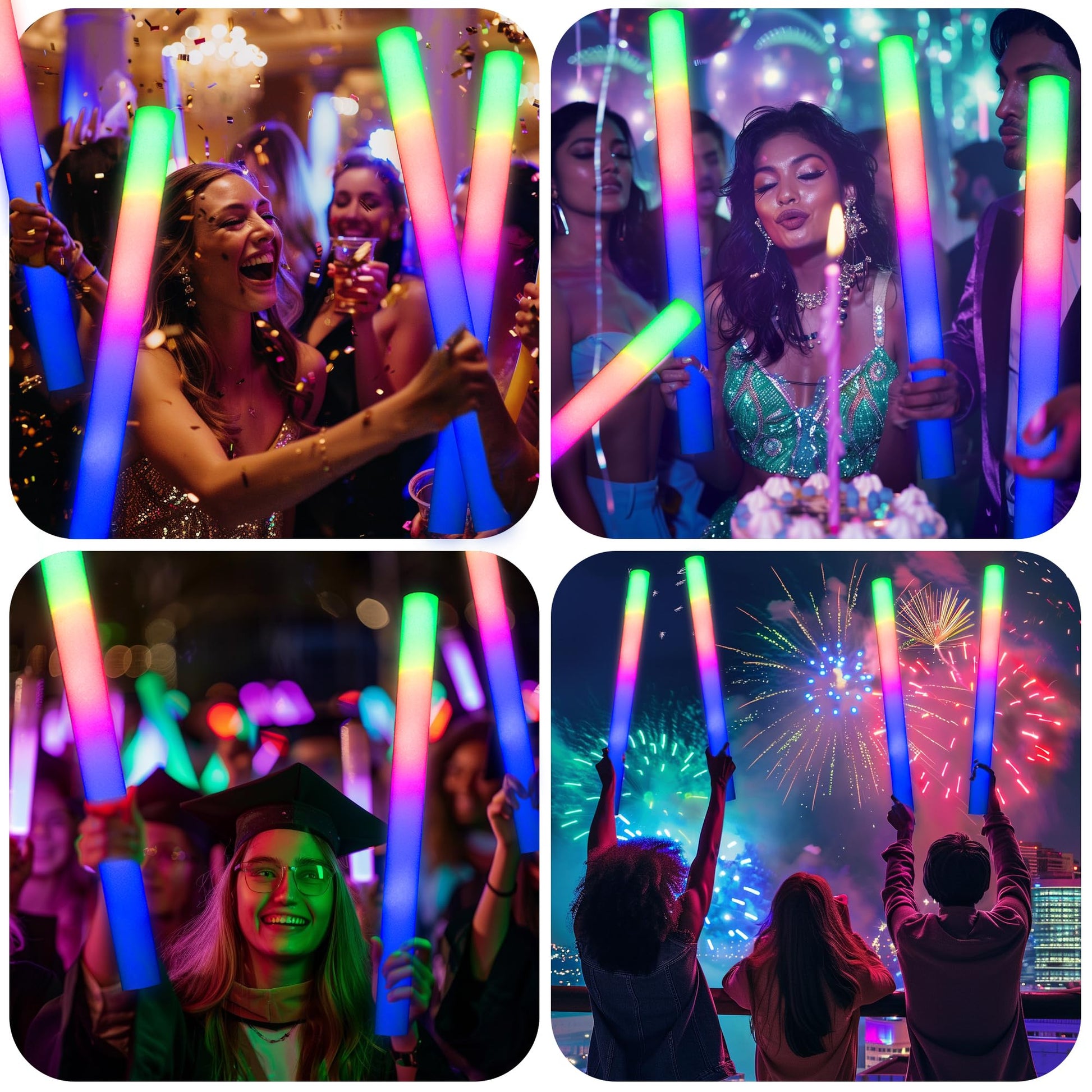 - 【LED Foam Glow Stick】: Simply press the power button to switch between three vibrant light modes: fast flashing, slow flashing, and alternating flashing. Choose your preferred mode to create a fun and festive atmosphere at any party.