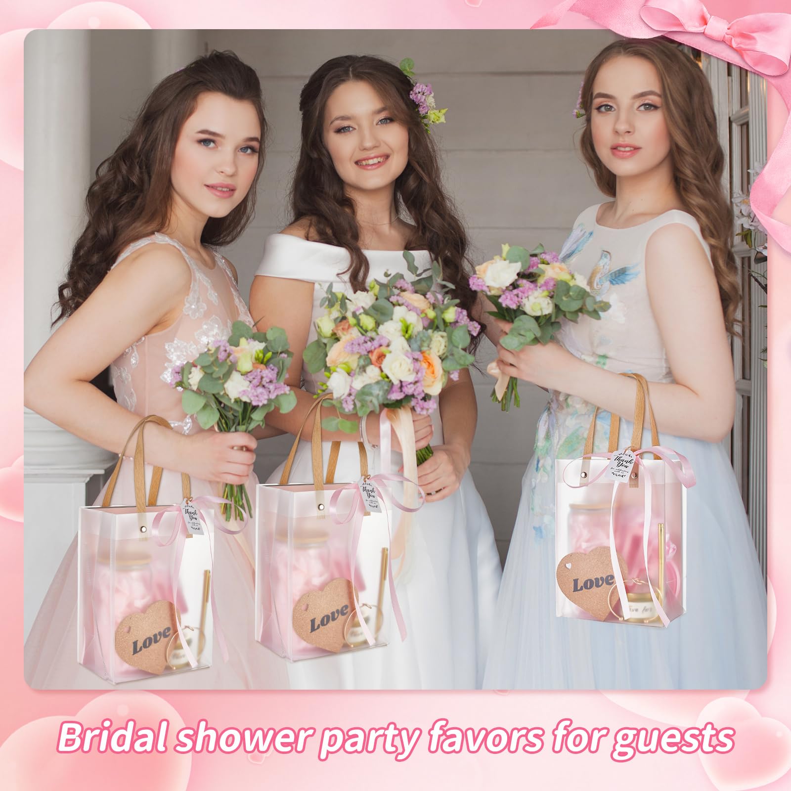 - All-Inclusive Surprise Bundle: Make your baby shower or bridal shower truly unforgettable with this 68-piece prize set. It includes everything needed for an elegant yet practical gift: 6 glass cans with bamboo lids and glass straws, 6 scented candles, 6 notebooks, 6 wooden coasters, 6 pens, 6 bracelets, 6 hair claws, 6 headbands, 6 gift bags, 6 tissue papers, 6 "Thank You" cards, 6 ribbons, and a roll of string. Thoughtfully coordinated, this set will impress your guests and leave them with cherished memories of your special day