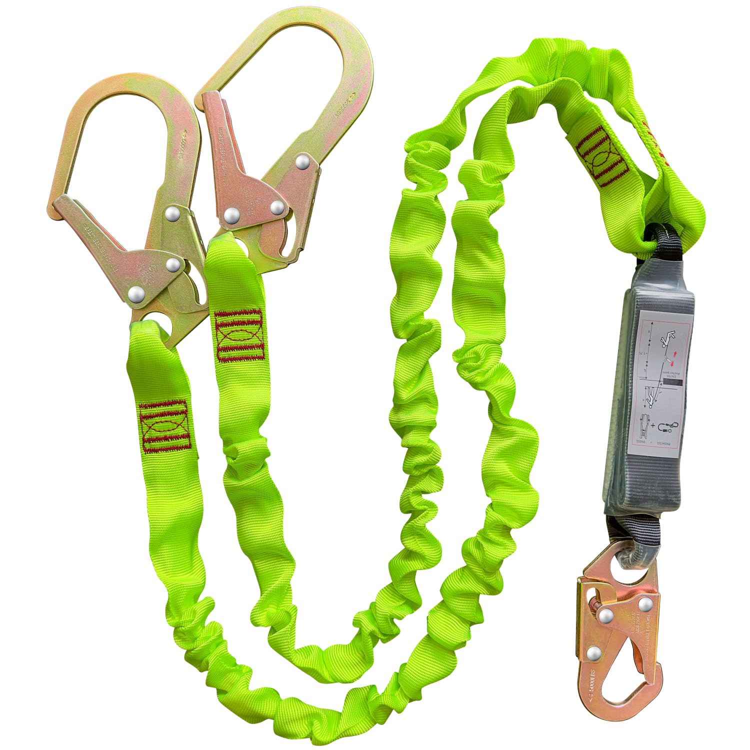 - 🧰INTERNAL SHOCK ABSORBER – Double Leg 6-Foot Fall Protection Shock Absorber with 100% polyester tubular green webbing. This sleek and lightweight fall protection device has an internal shock absorber that provides safety from the inside out, eliminating the need for a bulky shock pack. The integrated energy absorber has a maximum deployment distance of 48 inches (1.2 meters), an average arresting force of 900 lbs., and comes with a fall arrest indicator tag that breaks in the event of a fall.