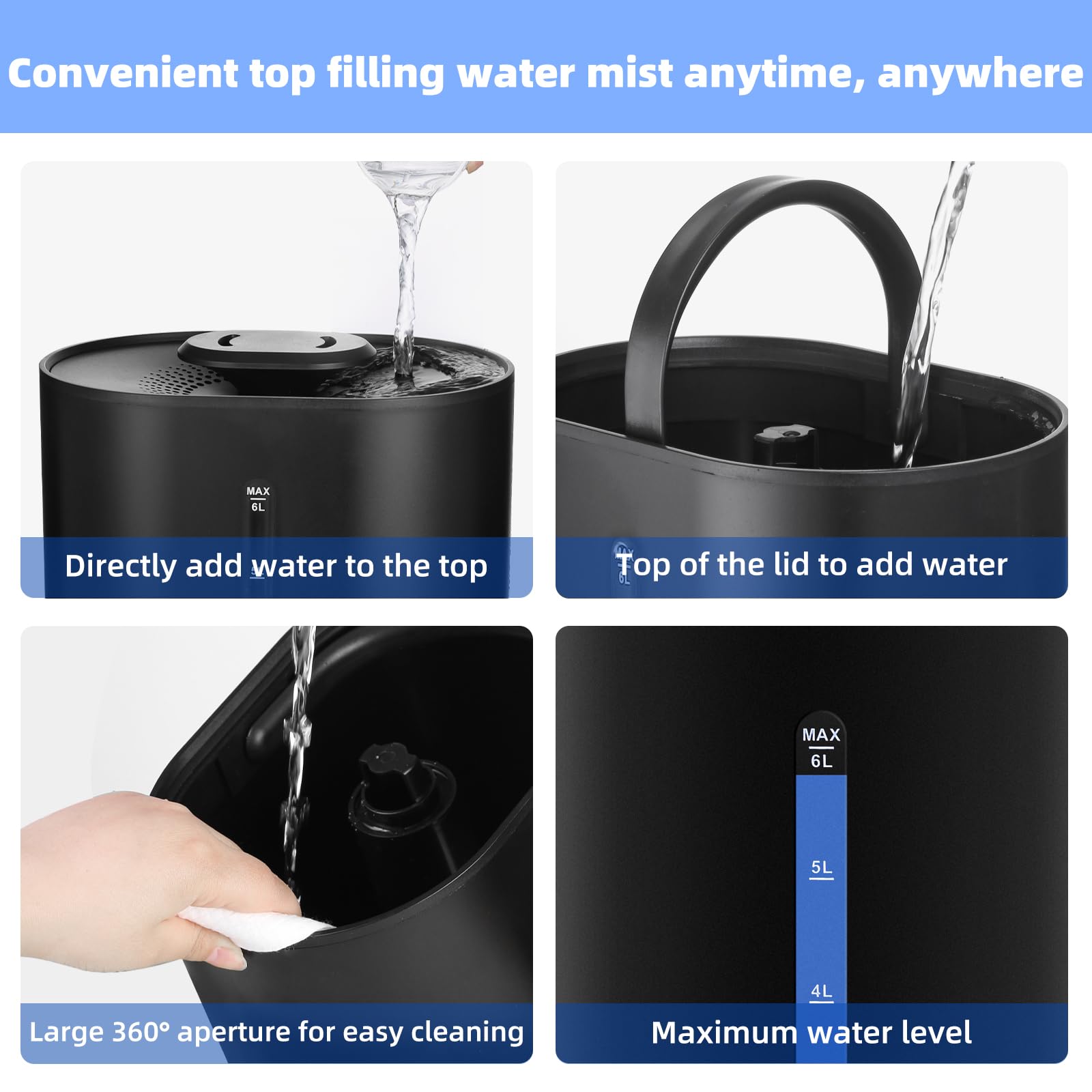 - Top-Fill Design for Convenience:Top fill humidifiers design revolutionizes refilling, letting you easily pour water directly into the tank. No tricky angles or tough openings, just pure convenience and a seamless experience.The 6L humidifier for bedrooms, large rooms,nursery, offices, indoor plant humidifiers, that is an ideal choice