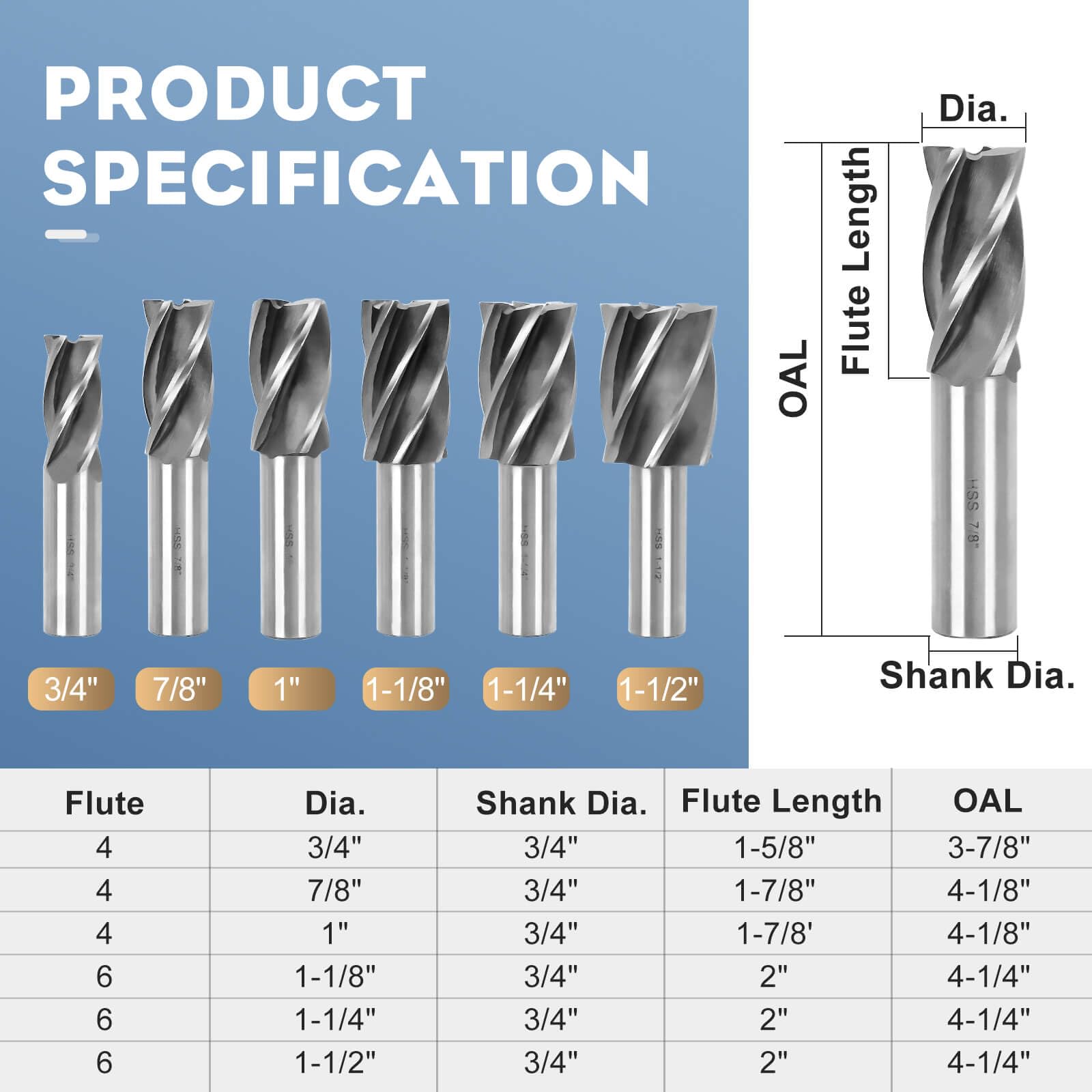 - 【Ideal for Hard Alloy Steel Processing】 - This 6PCS multi-flute high-speed steel end mill set is perfect for hard alloy steel. With sizes like 3/4'', 7/8'', 1'' (4 flutes) and 1 - 1/8'', 1 - 1/4'', 1 - 1/2'' (6 flutes), it works great on Bridgeport milling machines for diverse milling tasks