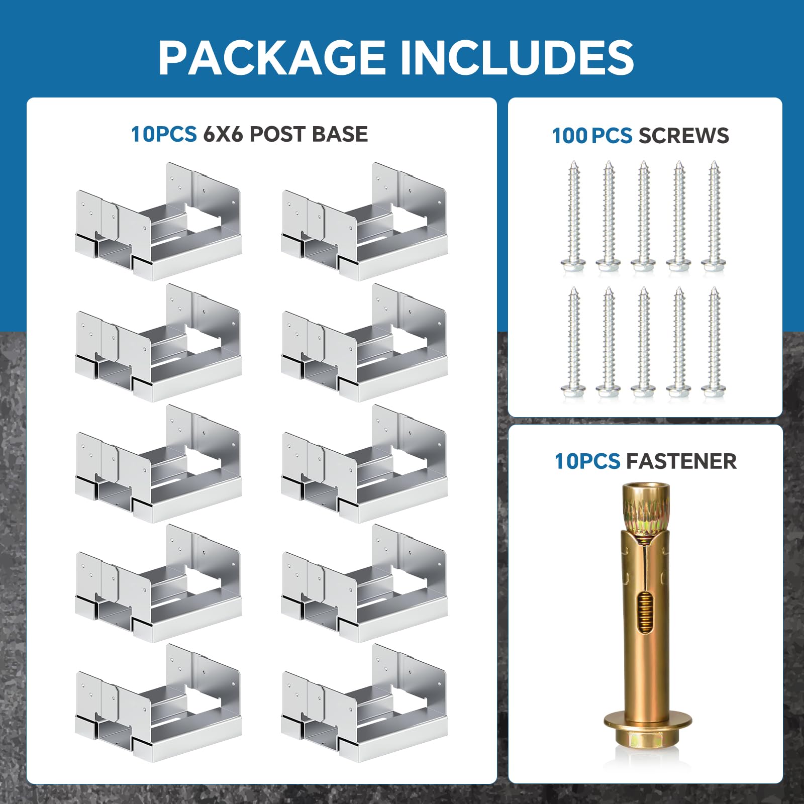 - 【Most Complete Kit】Compared to other post bases, our post base kit includes 10 pcs 6x6 post base, 100 pcs 304 stainless steel flanged Phillips power screws & 10 pcs matching concrete anchor. Complete kit saving your time to buy all required accessories