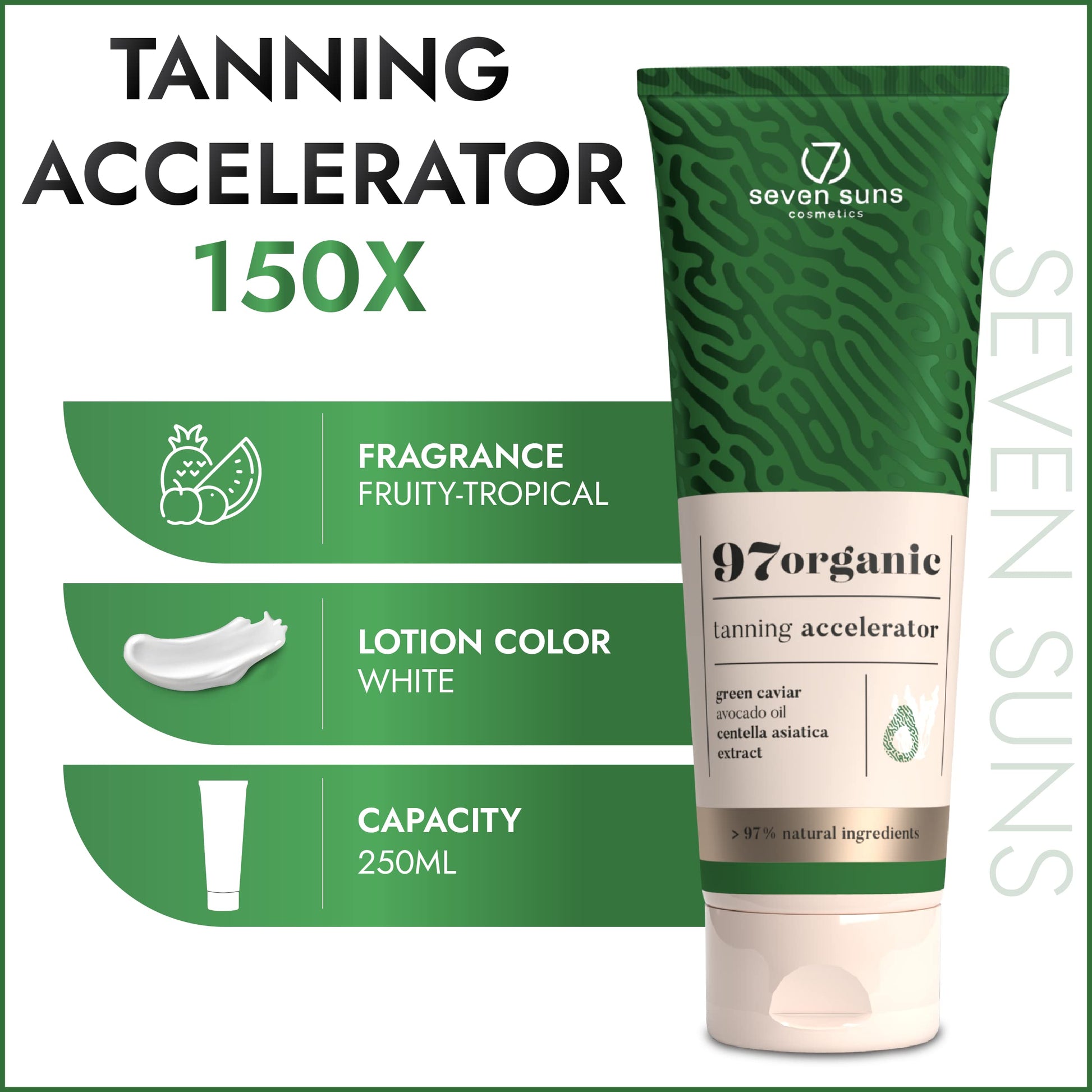 - RAPID TAN: 7 Suns is a tanning accelerator outdoor and indoor use for enhancing your tan in the blink of an eye. With this tan accelerator, you get proper hydration, wonderfully nourished skin, and a lack of signs of aging. Get tanned with this accelerator tanning lotion and enjoy your beautiful dark-tanned and glowing body!