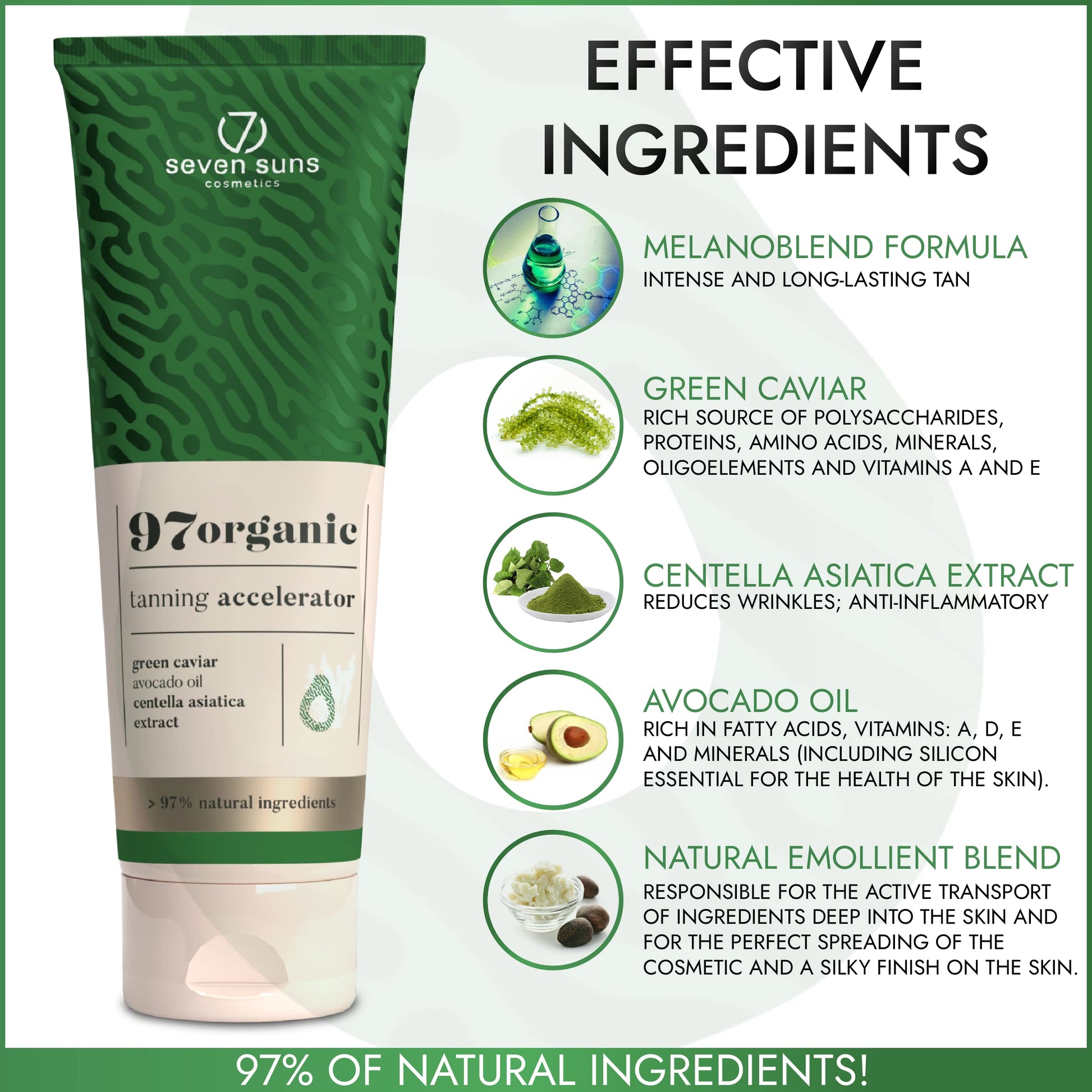 - KEY INGREDIENTS: Melanoblend formula - a unique complex of ingredients of natural origin, strongly influencing the acceleration of the appearance of an intense and long-lasting tan. Green caviar- It attracts and binds water like a sponge. Rich source of polysaccharides, proteins, amino acids, minerals, oligo-elements and vitamins A and E, Centella Asiatica extract, Avocado oil, and a mix of natural emollients.