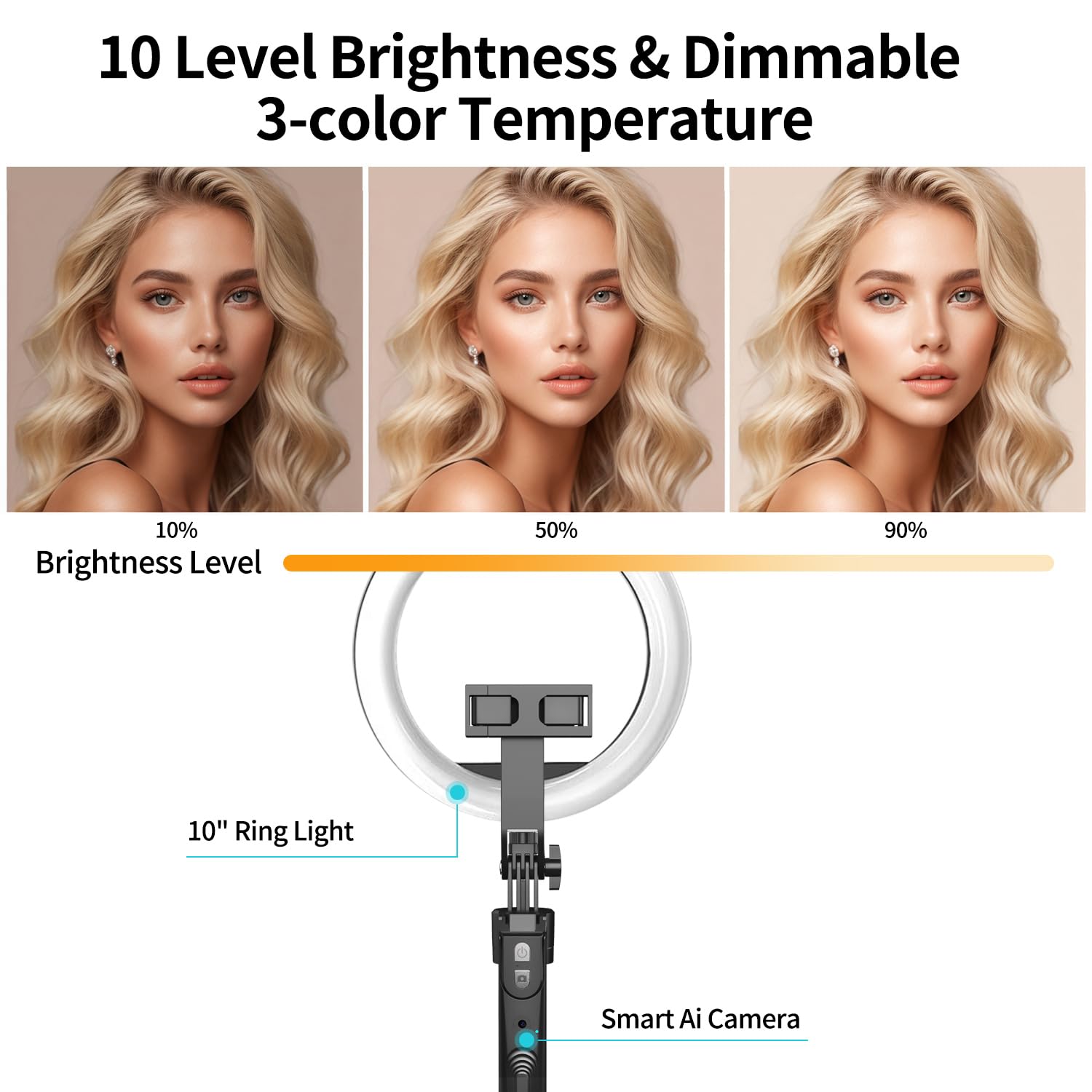 - 【Motion Tracking Tripod with 10" Ring Light】This motion tracking tripod comes with detachable 10" ring lights that you can choose to install to improve the quality of your videos when there is not enough light to record them. The ring lights have 3 colour modes (warm, cool and natural) and each mode has 10 levels of brightness.