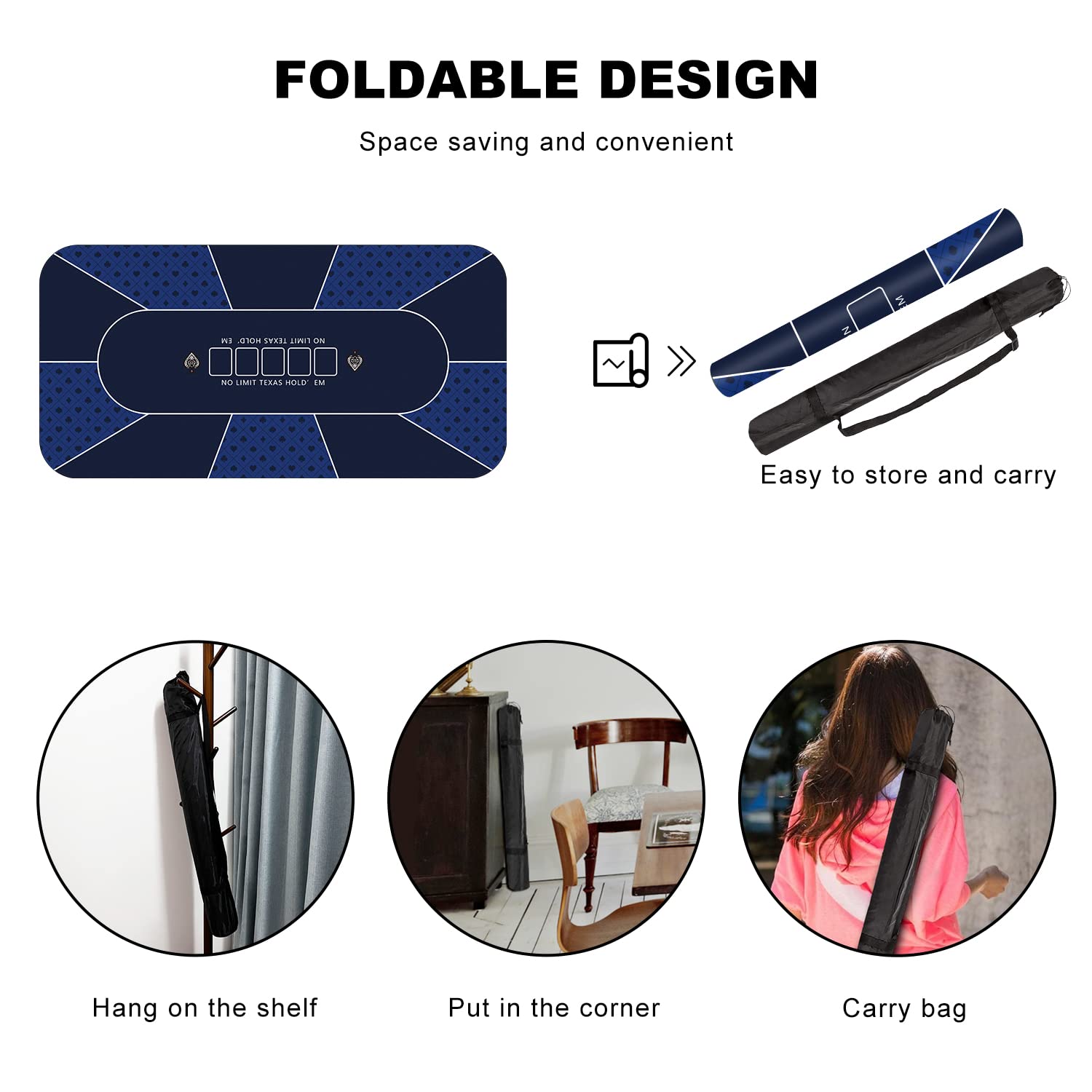 - [Portable Poker Mat For Fun Experience] Besides a foldable design, we also provide a portable black handbag that allows you to travel lightly and quickly, make poker game everywhere possible! The black handbag lets your texas hold'em poker mat easily rolled away for storage to save space and keeps clean inside.