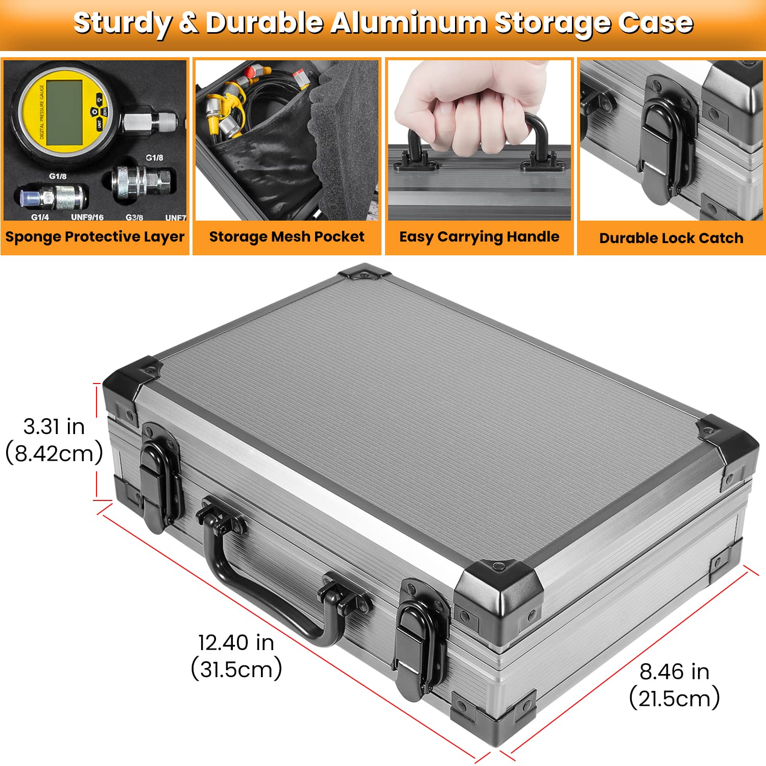 - Includes — 2 Intelligent Digital Pressure Gauges: 0-700BAR/10000PSI/70Mpa | 9 Type Test Couplings: 1×G1/8", 1×G1/4", 1×G3/8", 1×M10*1, 1×M10*1.25, 1×M14*1.5, 1×UNF 7/16-20, 1×UNF 9/16-18 and 1×NPT 1/4-18 | 3 Type Quick Connectors | 2 Test Hoses and a Sturdy Aluminum Carrying Case.