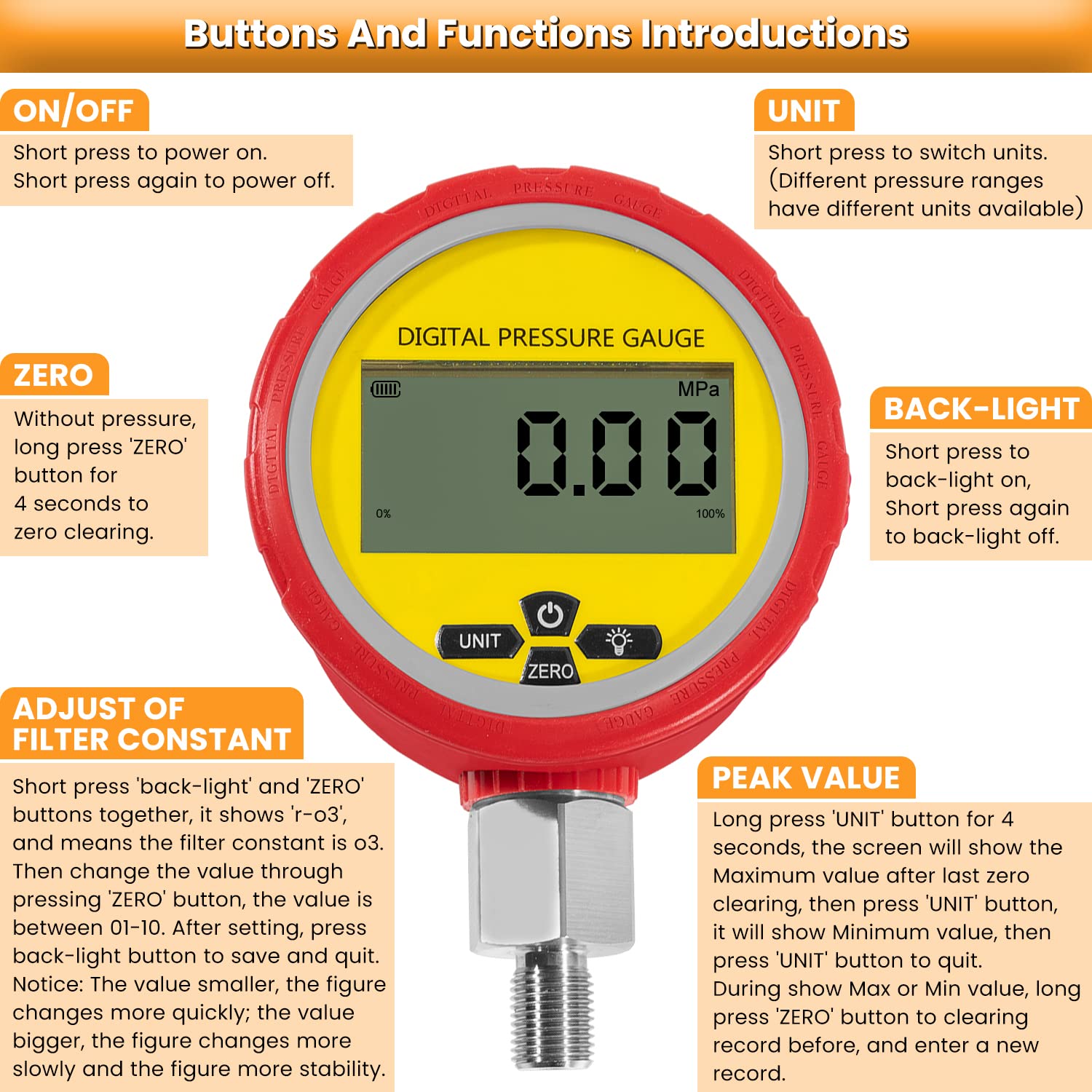 - Superior Material — Premium grade hard stainless steel housing with a silicone case, anti-corrosion and impact resistance. High-precision piezoresistive pressure sensor and display the pressure accurately in real time. Nylon lining layer hose with super industrial fiber enhanced layer and polyurethane outer cladding. Waterproof, dustproof and shockproof for long-lasting reliability.