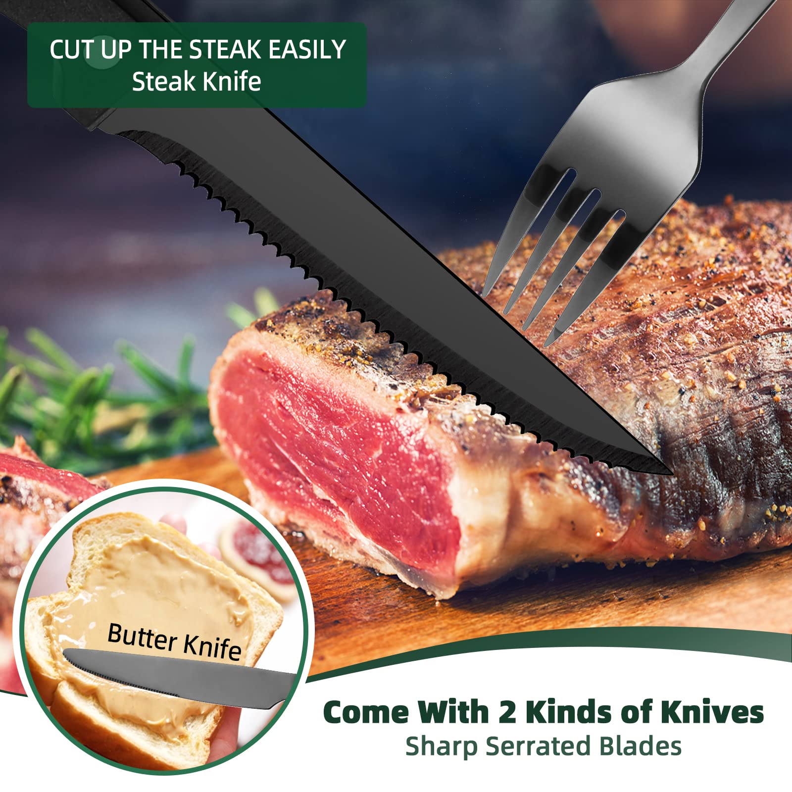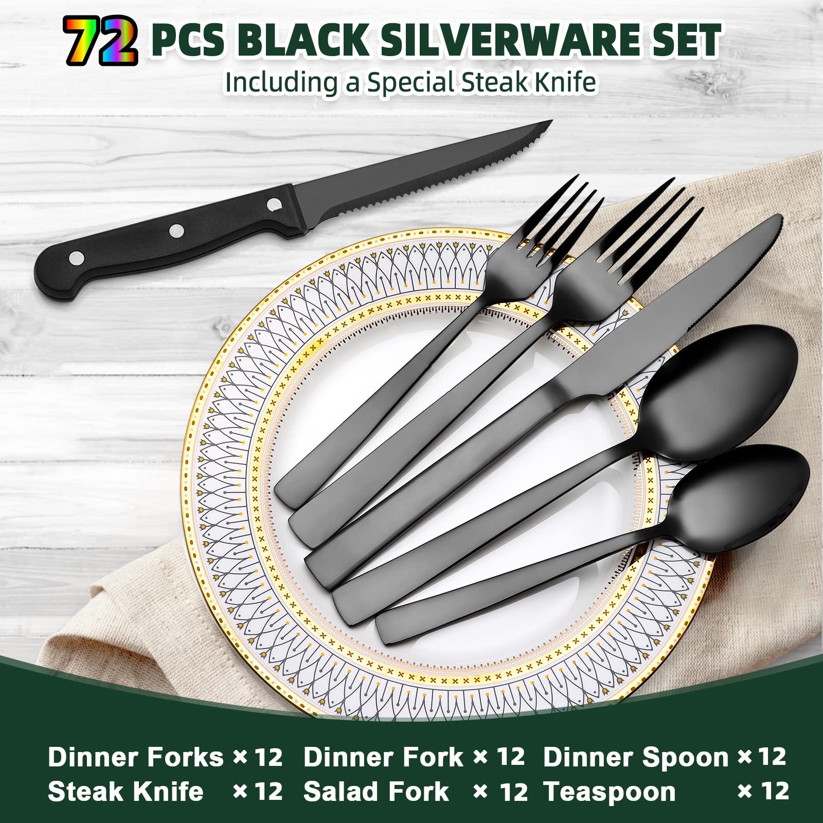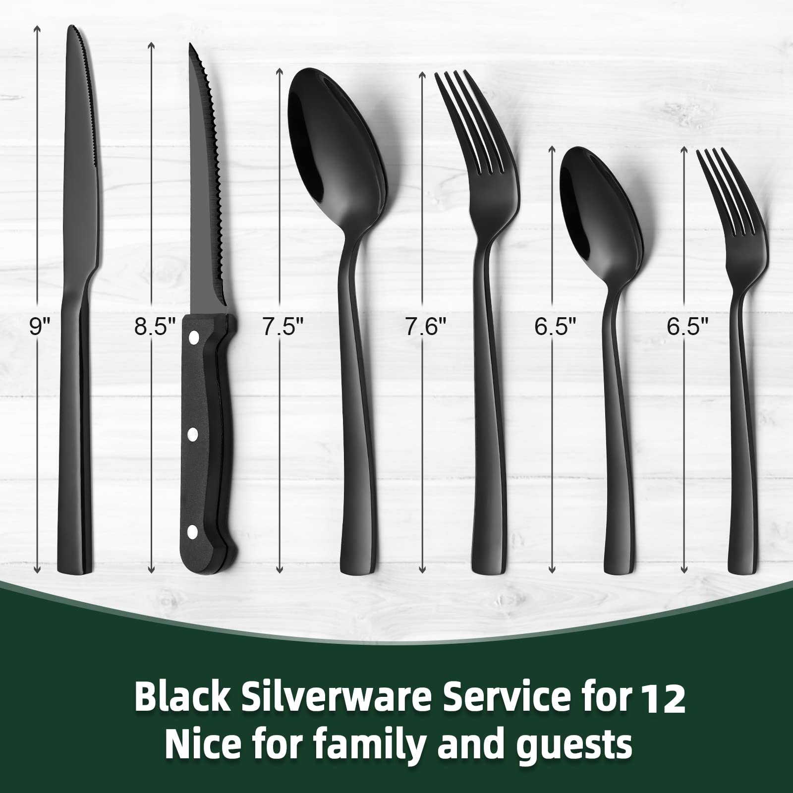 - Black Utensil Set | Dinne Knife & Steak knife : Compared with other silverware set, CEKEE silverware sets for 12 has two different type knives without needing to buy another Steak Knives to use. This black cutlery set includes 12 Steak Knives, 12 Butter Knives, 12 Dinner Forks, 12 Salad Forks, 12 Dinner Spoons and 12 Tea Spoons, which is satisfy with your all dining need perfectly