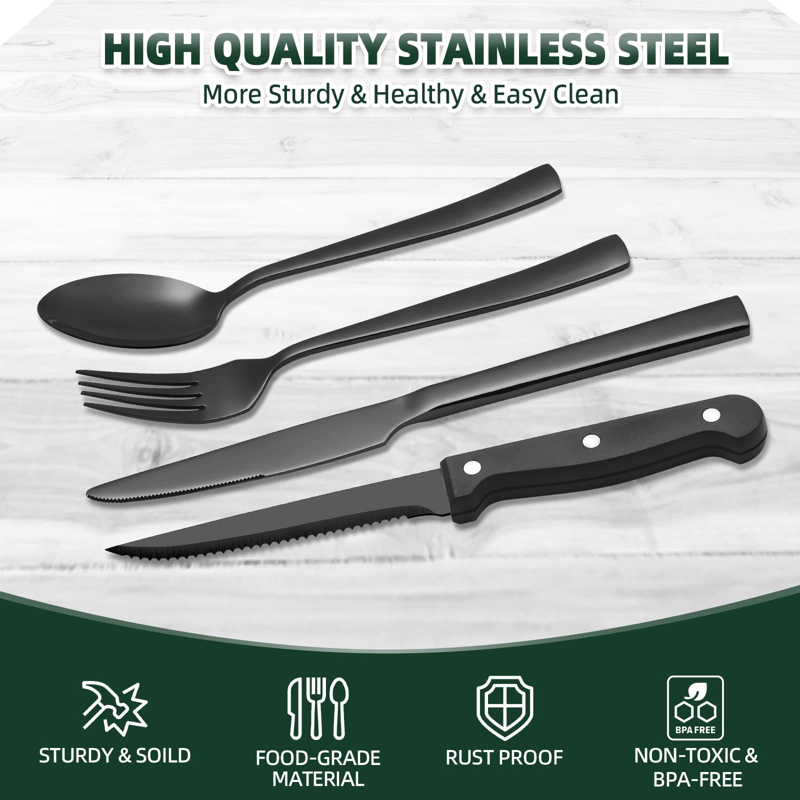- Premium Anti-Corrosion Material | 60% More Durable: Crafted from 18/0 restaurant grade stainless steel, offering 30% better rust resistance than other silveware set. What's more, knife fork spoon set is anti-corrosion and no rust spot, BPA-FREE and no metal aftertaste. This kitchen utensils set is very safe and perfec for daily use and long-term use