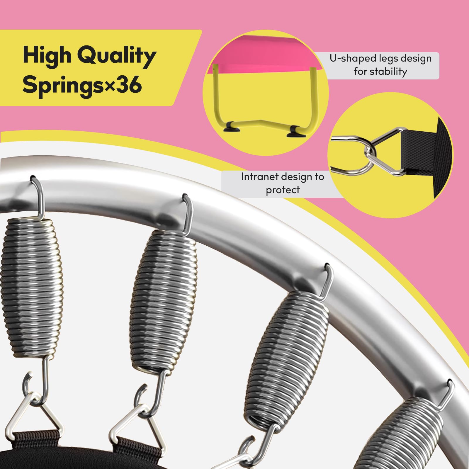 - 【FUN TO USE】The Kids Trampoline has 36 fully stretched springs so kids can experience the fun of bouncing as they play. Jumping is a great way for kids to release their energy and develop gross motor skills for fun as well as exercise. Keep your kids from getting addicted to video games, this trampoline is the perfect choice,can be installed indoors, outdoors, garden or backyard. Really a creative trampoline toys for toddler indoor/outdoor.