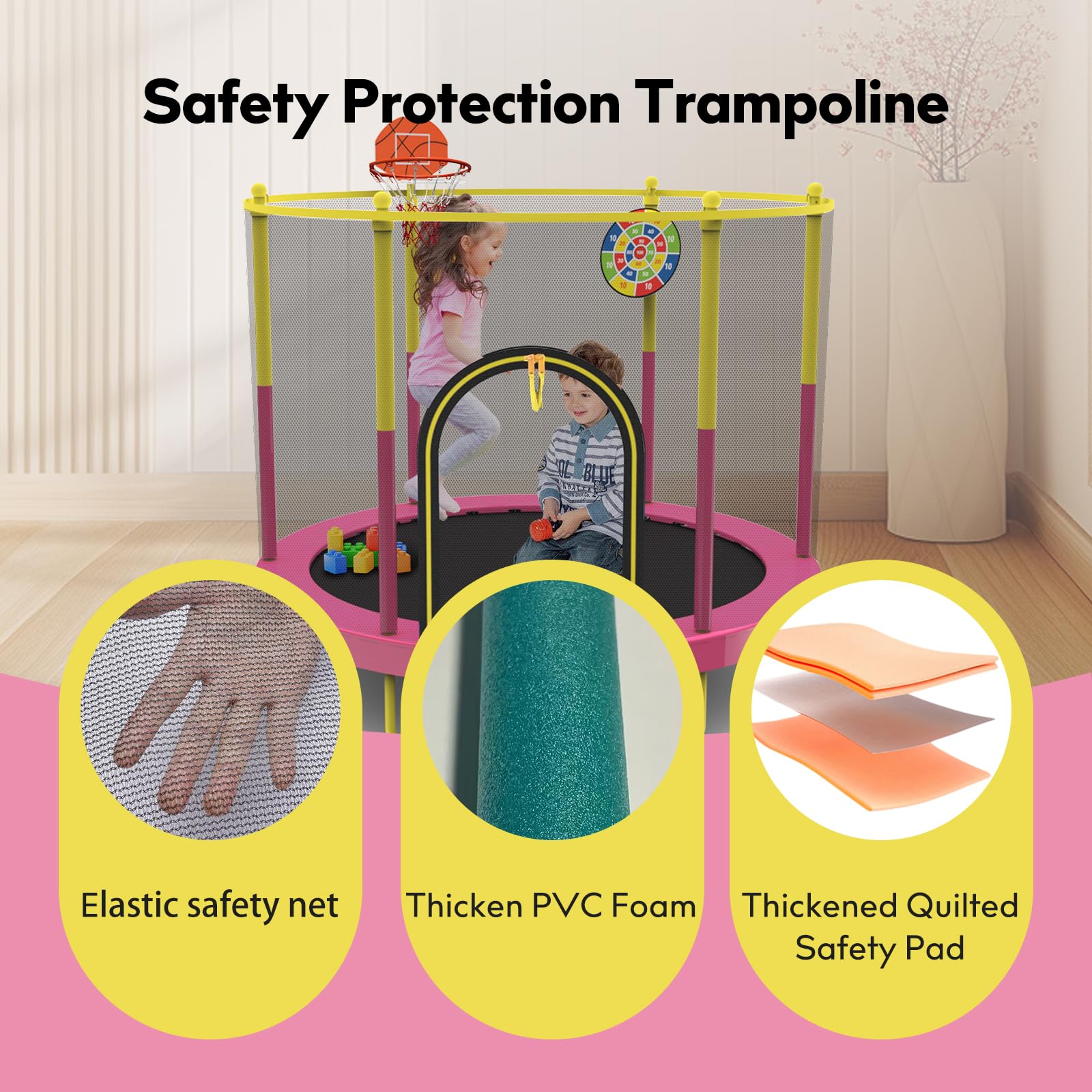 72" Trampoline for Kids with Net,6 FT Indoor & Outdoor Small Toddler Trampoline with Basketball Hoop & Dart Board for Ages 1-8, Birthday Gifts for Boys & Girls, Baby Toddler Christmas Toys Pink