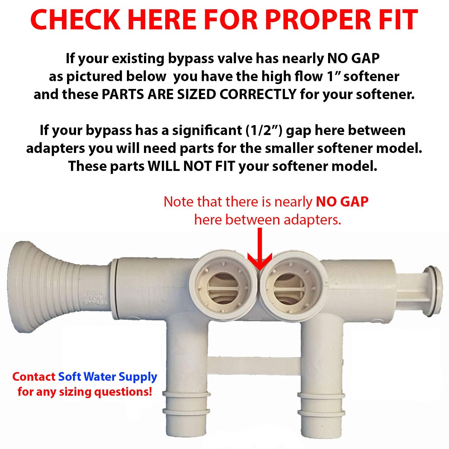 Details: High Flow 1" Water Softener Bypass Valve Kit with (2) Adapters, (4) Clips, and (4) O-rings Compatible with many brands including Kenmore, GE, Whirlpool, Morton, NorthStar, EcoWater, EcoPure, and more! Original manufacturers replacement part See attached image for proper fit on your 1” high flow water softener. This part will NOT fit the smaller sized model.