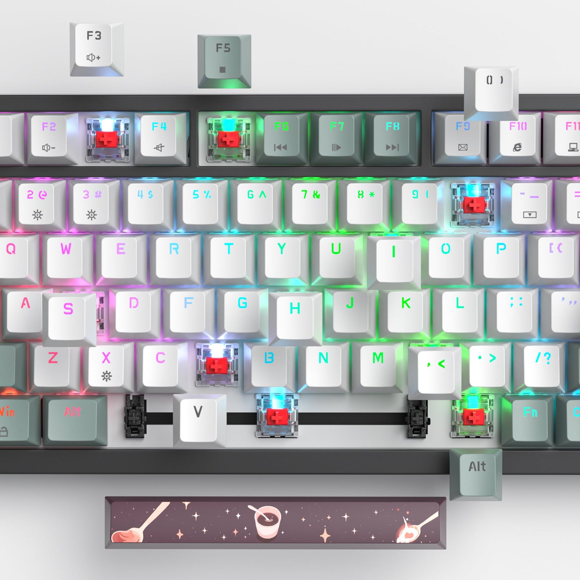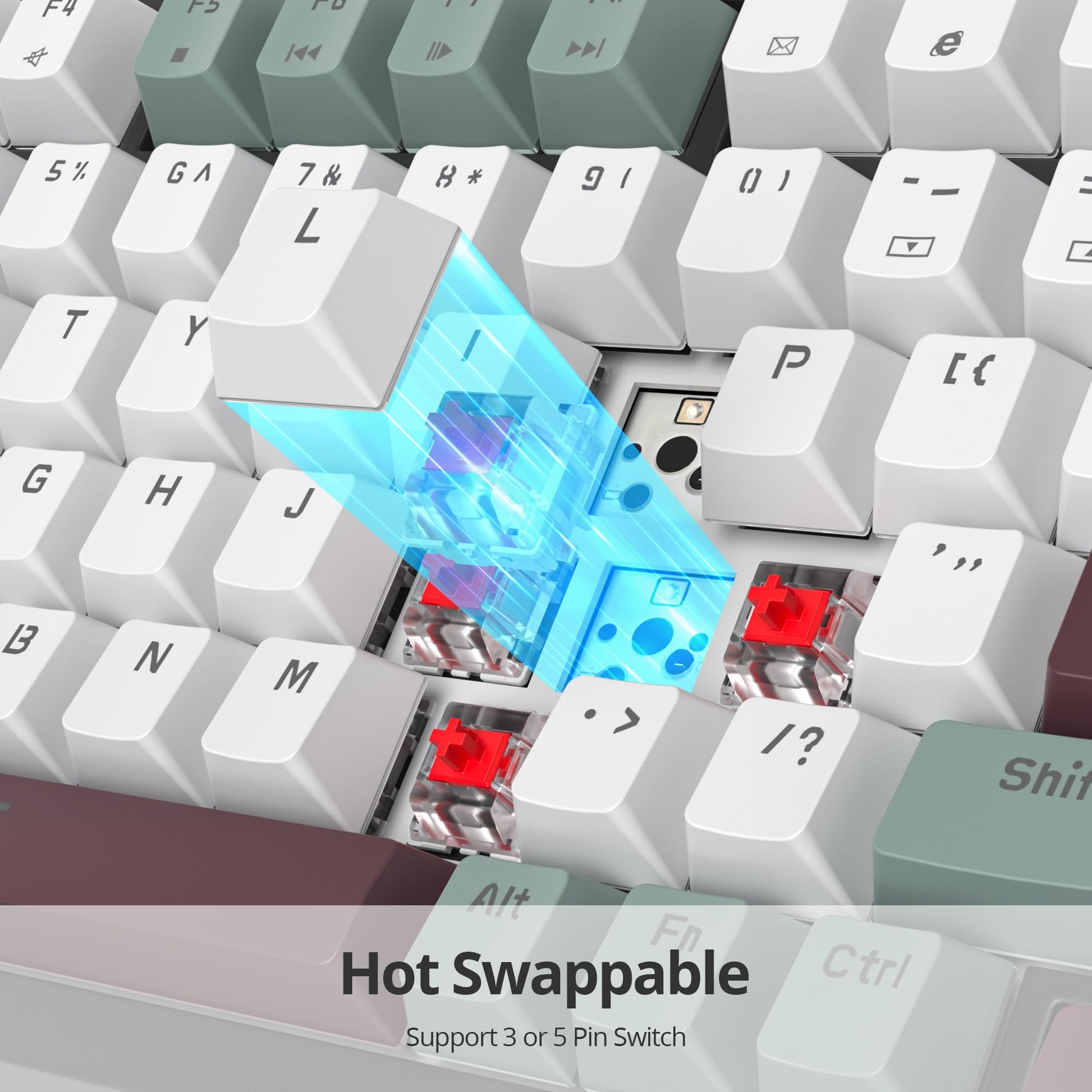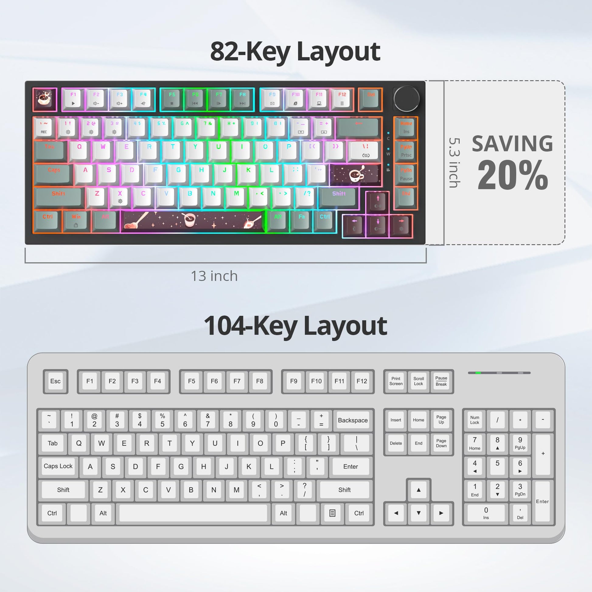 - 【75% RGB Mechanical Keyboard】75% layout with 82 keys, retains separate arrow keys, making the desktop cleaner without sacrificing essential functionality. It can perform the commands of a full-size keyboard with more space for mouse movement.This gaming keyboard is a boutique equipment for PC gamers and office users.