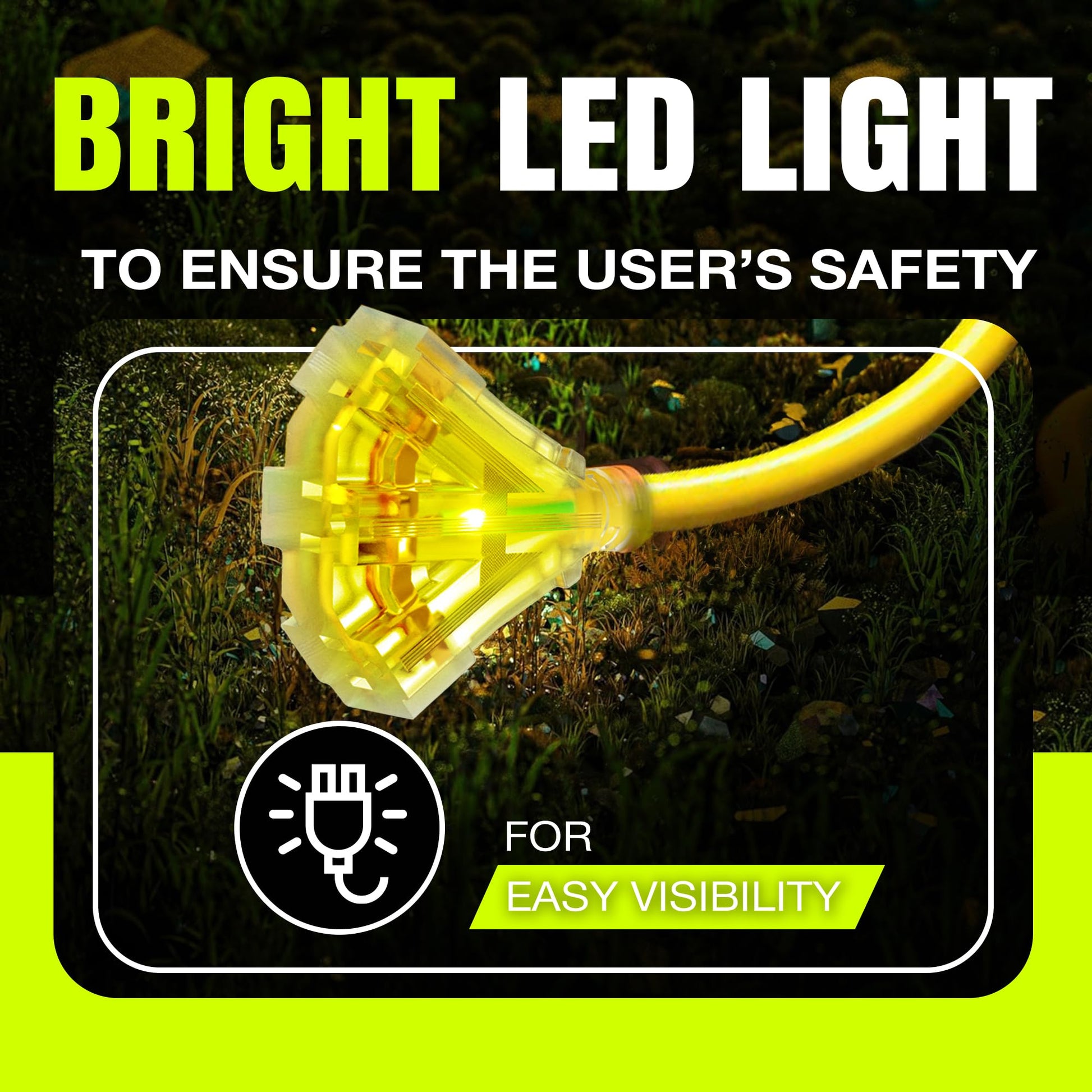 - LIGHTED END FOR VISIBILITY & SAFETY: With a lighted end to indicate power and a brightly colored PVC jacket, this three prong extension cord minimizes tripping hazards and improves safety in busy or poorly lit areas. Stay safe while powering up with an easily noticeable extension cable. The innovative design not only enhances operational safety but also ensures that the indoor / outdoor power cord is easily identifiable among your tools and equipment, preventing accidental disconnections.