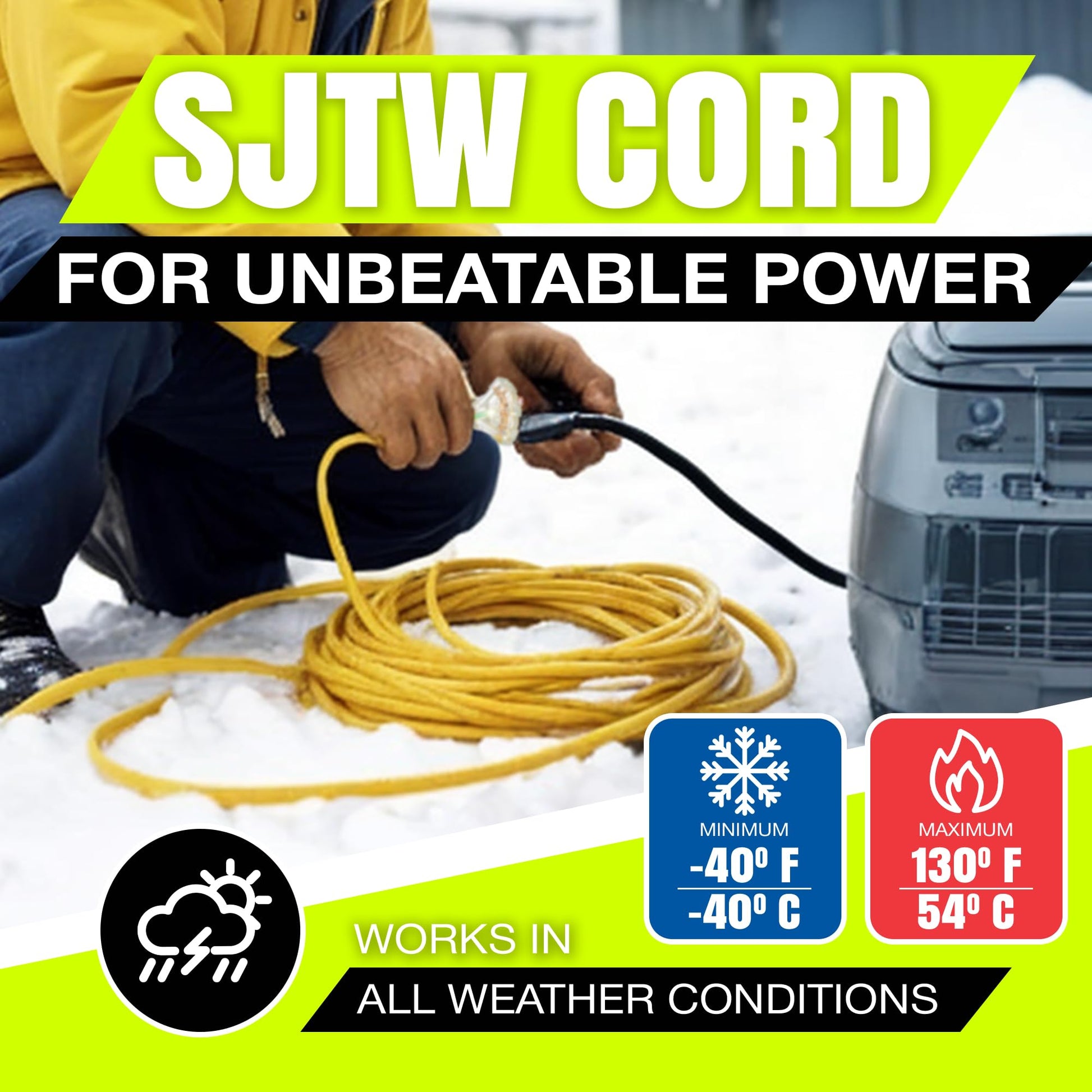 - POWERFUL: This 75FT, 12 Gauge 3-prong, 3-Outlet, SJTW, Yellow extension cord is designed for extra safety and durability, The cable extension electrical cord supports 15 AMP, 125 Volts, and up to 1875 Watts, ensuring robust performance for high-demand equipment, this 1 Pack embodies reliability, quality, and the grounded power to handle your most challenging projects with ease.