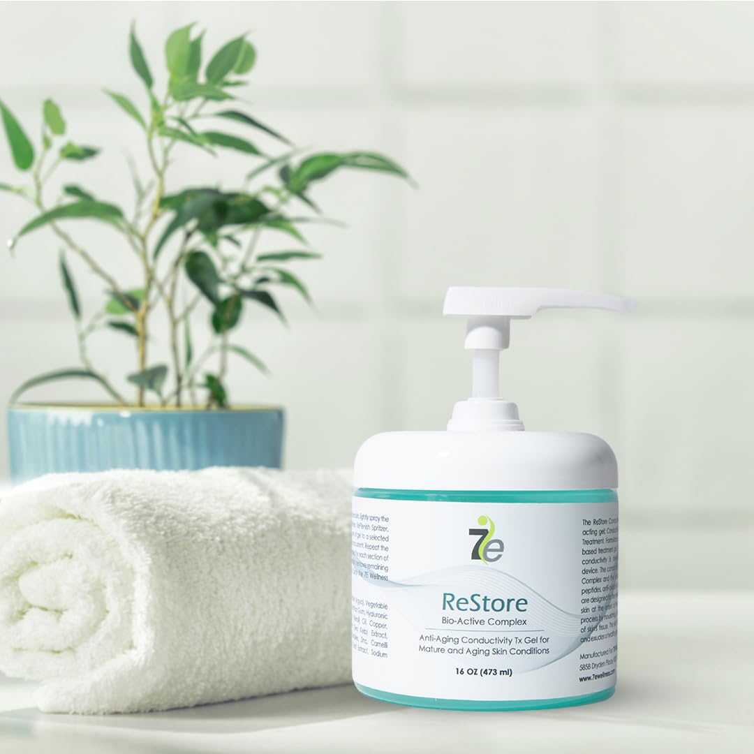 Details: The Treatment Gel for Mature and Anti-Aging Skin Conditions ReStore Conductive Gel focuses on the health and integrity of your skin from the onset of the aging process. As your skin ages, there are a number of changes that take place that compromises it if not treated Formulated for Intense Hydration The infused essential properties of the following active ingredients will leave hydrated, tightened, and with a healthy glow. Green Tea - Contains extremely high levels of polyphenols and antioxidants that protect cells from free radicals. Neroli - Helps regenerate new skin cells while invigorating, softening, and moisturizing the skin. Collagen Peptide Concentrate - a natural protein that allows the skin to maintain its integrity and turgor at the basal layers. Copper - Anti-aging and regenerates new collagen and elastin proteins for firmer and more hydrated-looking skin. Seaweed/Kelp - Ultra-hydrating qualities that boast anti-aging benefits. Contains natural amino acids, vitamins and minerals. Zinc - Helps repair damaged tissue and is ideal for topical irritations and other minor skin conditions. Helps alleviate swelling Your Face Will Love This Contour your face and get that glow with the magic of microcurrent technology.