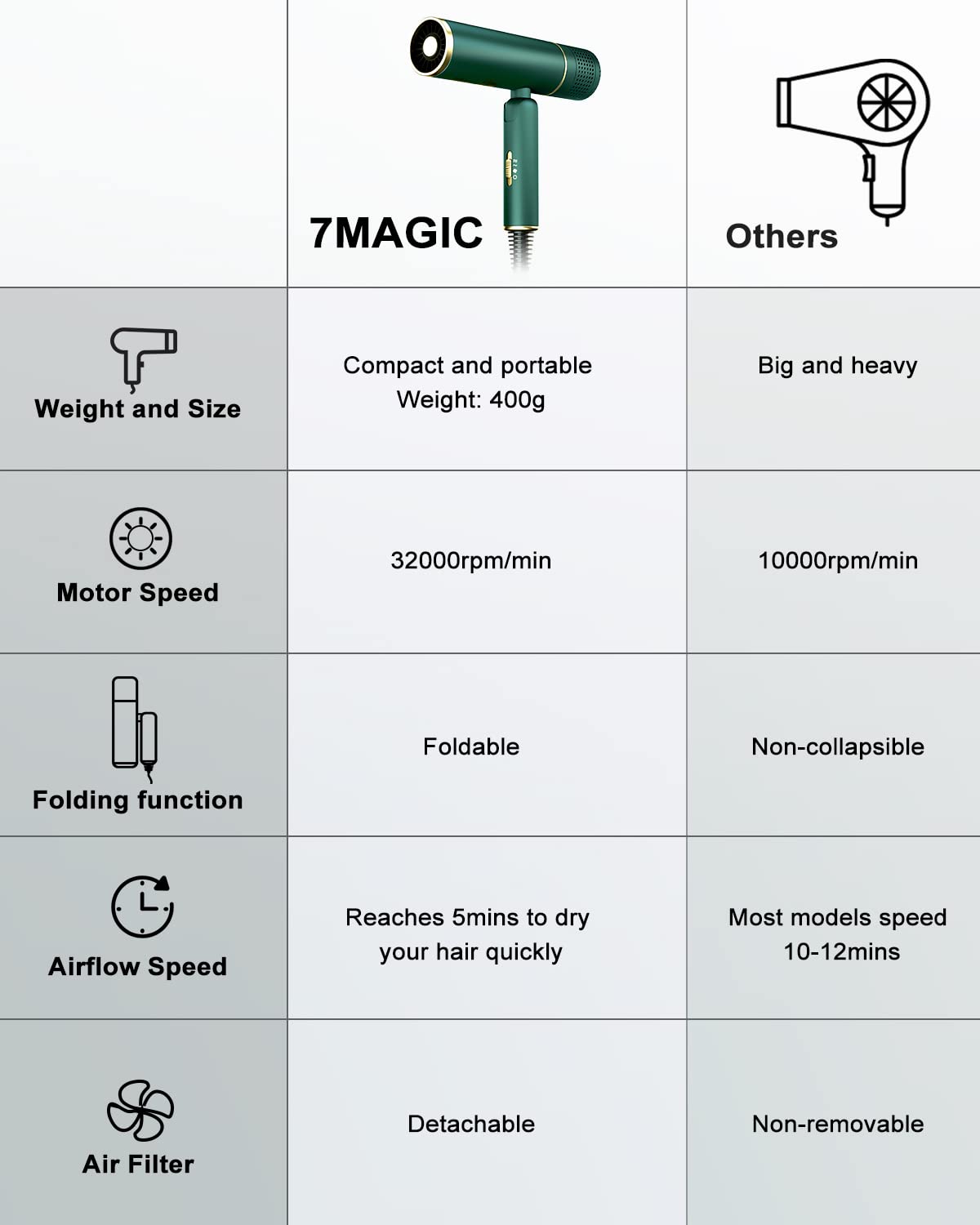 - Blowing Hair Time 30% Faster than Ordinary Hair Dryer - 7MAGIC hair dryer's wind speed is 2 times the other hairdryer; the maximum wind speed is 18m/s; the rotational speed is 32000 RPM. Drying hair is 30% faster than the ordinary hair dryer. It only takes 1-2 minutes for short hair, 3-5 minutes for medium-length hair, and 5-8 minutes for thick and long hair