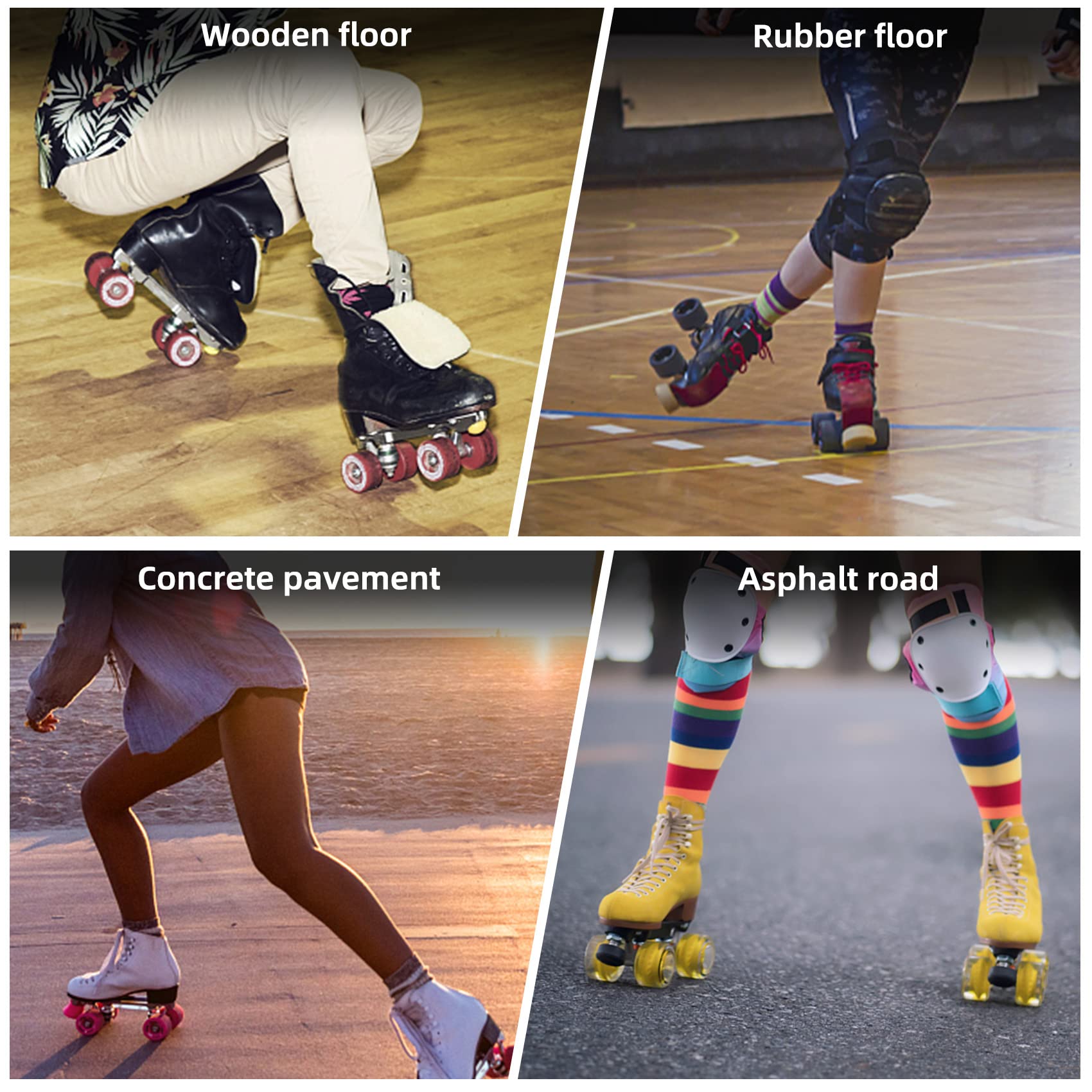 - 【78A HARDNESS】 These roller skate wheels are made of durable polyurethane polymer material, wear-resistant, good pressure resistance, and 8-wheel PU shock absorption, skating more comfortable. Suitable for many occasions, indoor, outdoor, asphalt roads, and parks.