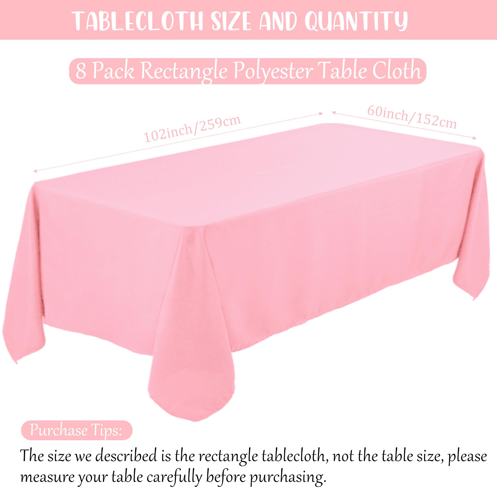 - Package Include: you will get 8 pieces pink polyester rectangle tablecloth, enough quantity is suitable for wedding banquets and various parties, the size of each tablecloth is approximately 60x102 inches / 152x259 cm, which is large enough to cover 4FT or 6FT rectangle tables, classic in color and exquisite in design, the solid color makes them suitable for various occasions, instantly heightening the elegance of your table.