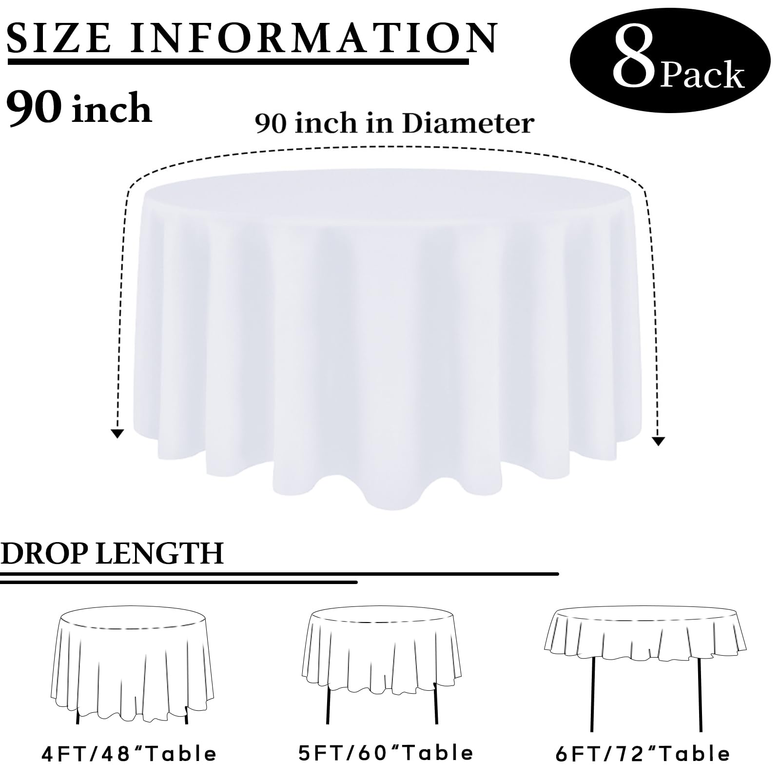 - 【Hight graded Material】: Our 90 inch round tablecloth come in 8 packs and crafted from high-graded polyester, perfect to protect and decorate your tables. This commercial-graded round table cloth offers both soft touch and smooth laying on the table. Coming in 8 packs make them the most economical choice.