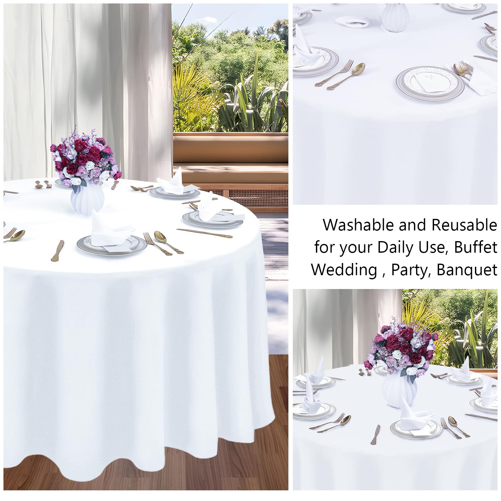 - 【Exquisite Workmanship】These round table cloths 90 inch are made from high graded and durability woven white polyester material. The table cloth round covers are seamless crafted from a single piece of polyester fabric with neat edges. Designed for longevity and your budget considering.