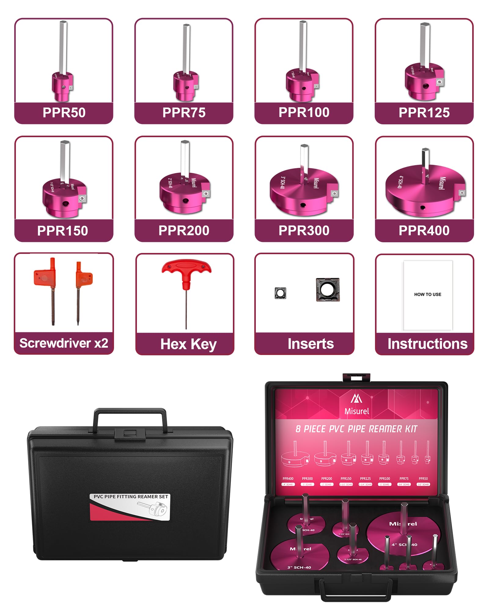 - 【8 Sizes Set】: PVC pipe fitting tools comes with 8 sizes: 1/2 '', 3/4 '', 1 '', 1-1/4 '', 1-1/2 '', 2 '', 3 '', 4 ''. And 1 hex wrench, 2 screwdrivers, 2 replacement carbide Inserts. Equipped with a steel hex shaft, it's compatible with 1/2'' standard drills, cordless drills, and impact drills.