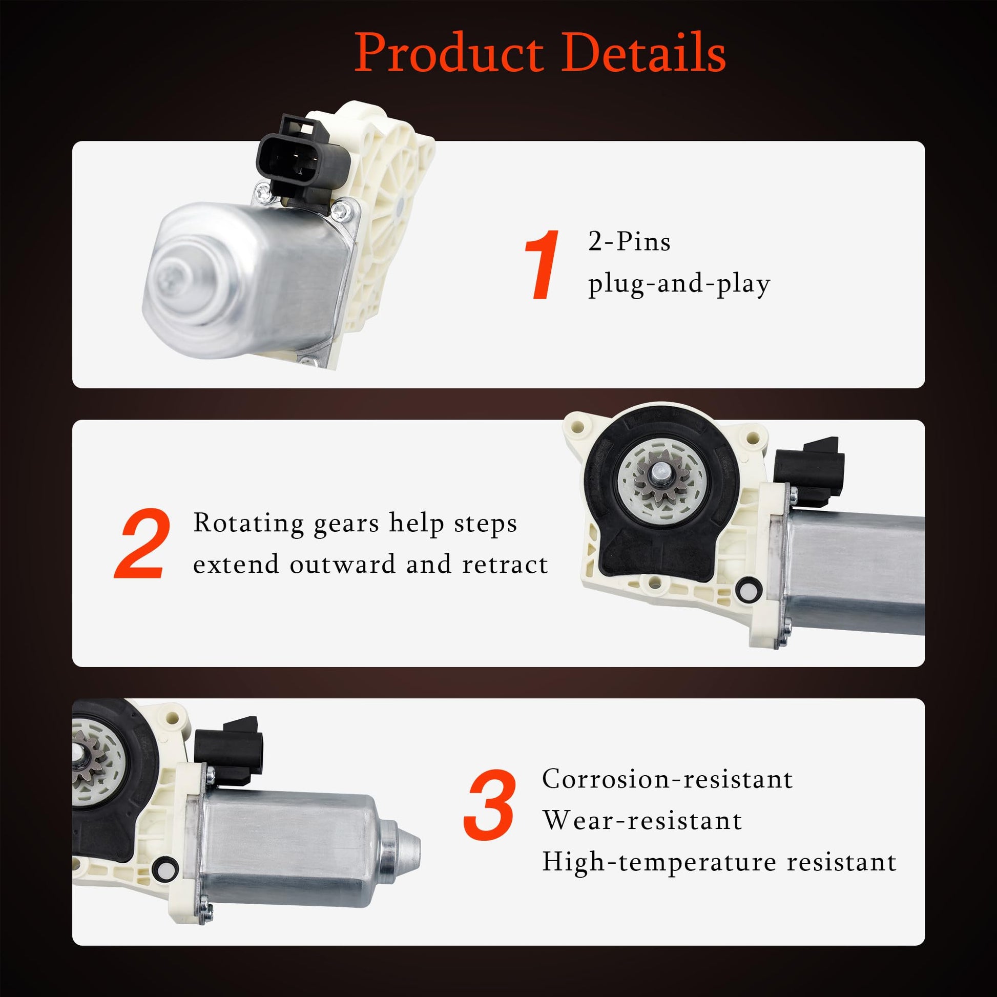 - 【HIGH-QUALITY MATERIALS】 We use high-quality metal and plastic to manufacture our electric side step motors. These materials are carefully selected for their resistance to corrosion, abrasion, and high temperatures to ensure long-term stability.