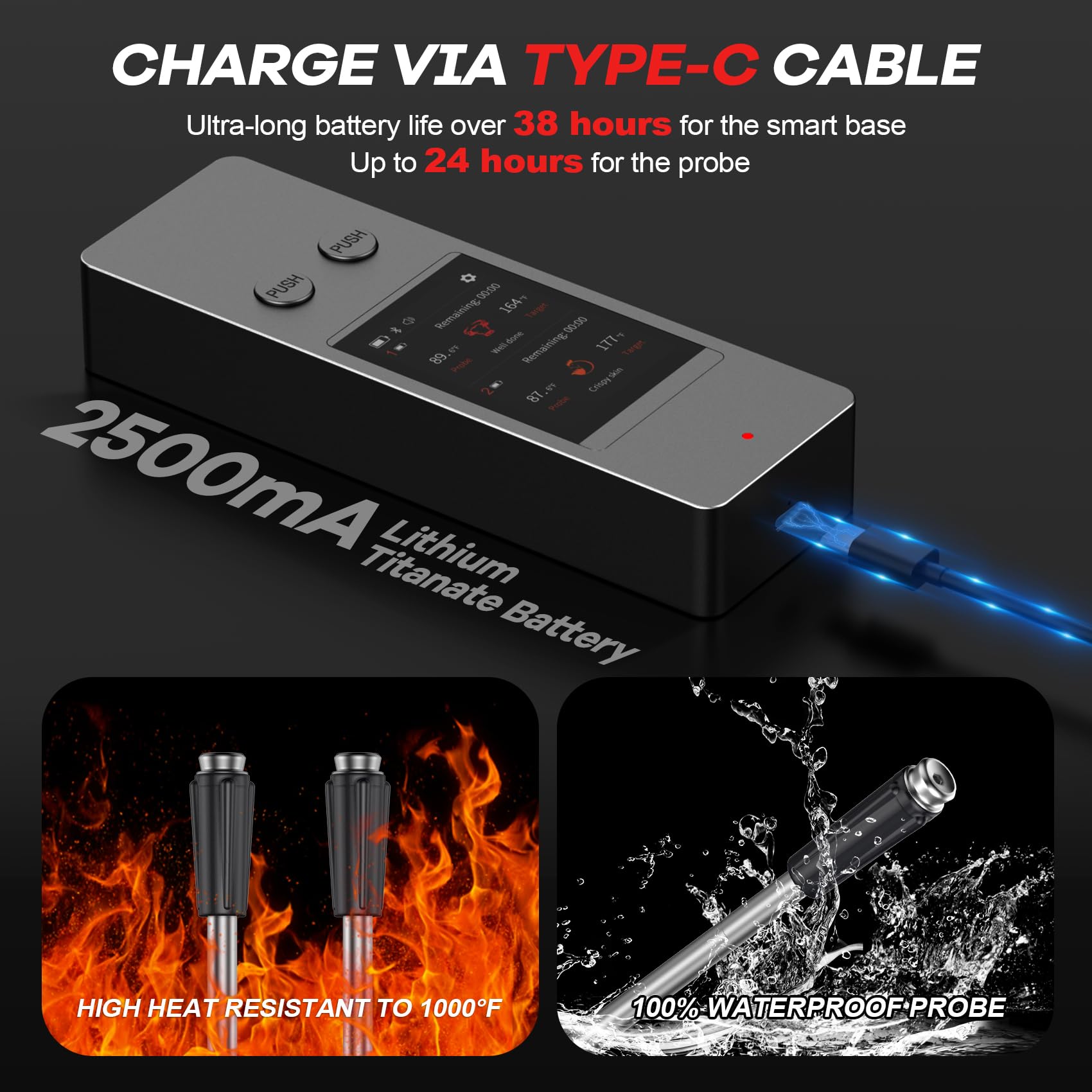 - Precision Dual Probe: Wireless thermometer with two ultra-thin probes, ceramic handle withstands up to 1000°F and allows you to monitor time and temperature for two different dishes at once. Meat thermometer equipped with 8 sensors and NIST-certified , delivering ±0.5°F accuracy and 0.01°F resolution.