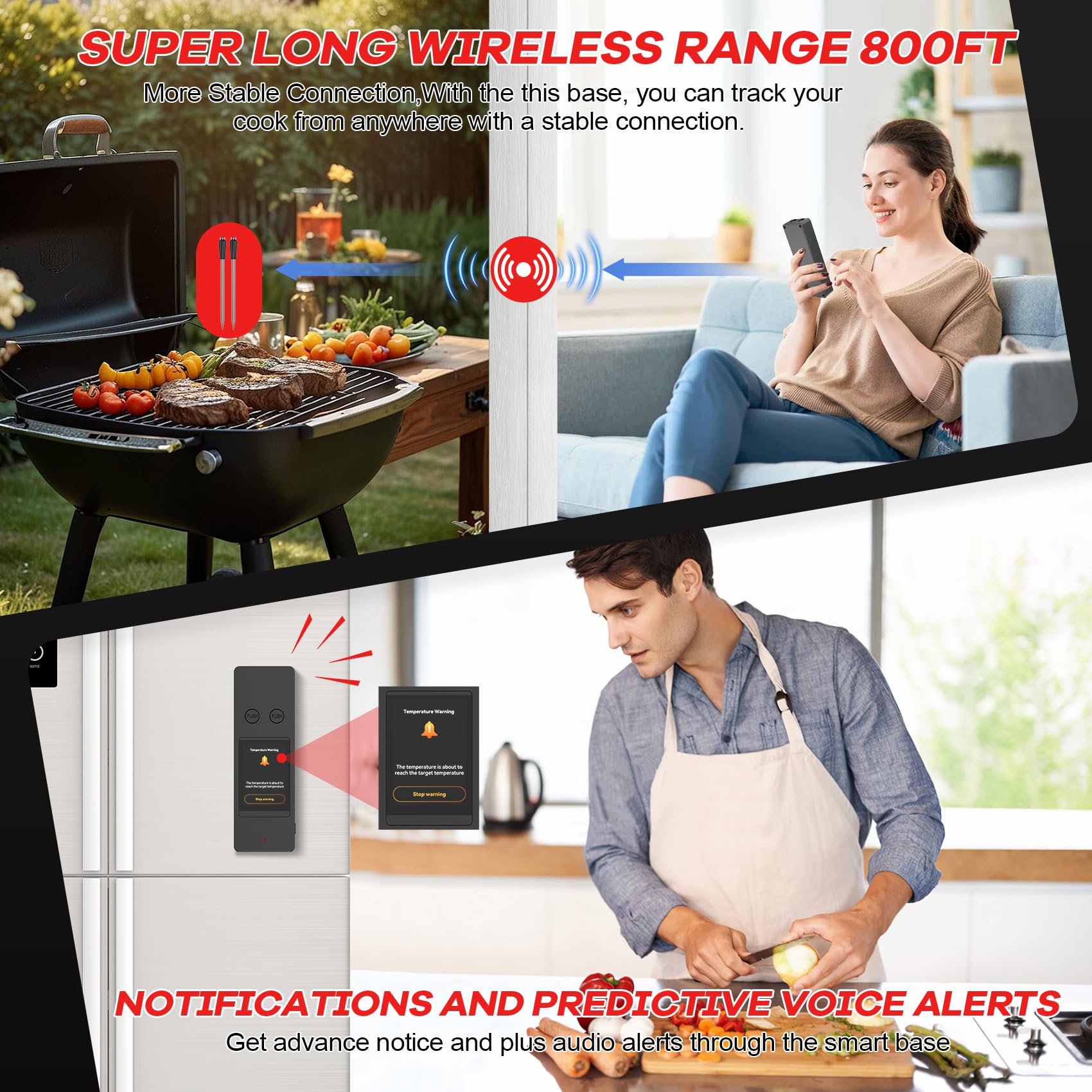 - Stable Connection: Digital thermometer for cooking features the lastest bluetooth technology, so the signal and connection will be more stable, feel free to monitor your BBQ in your backyard from your kitchen up to 800FT.