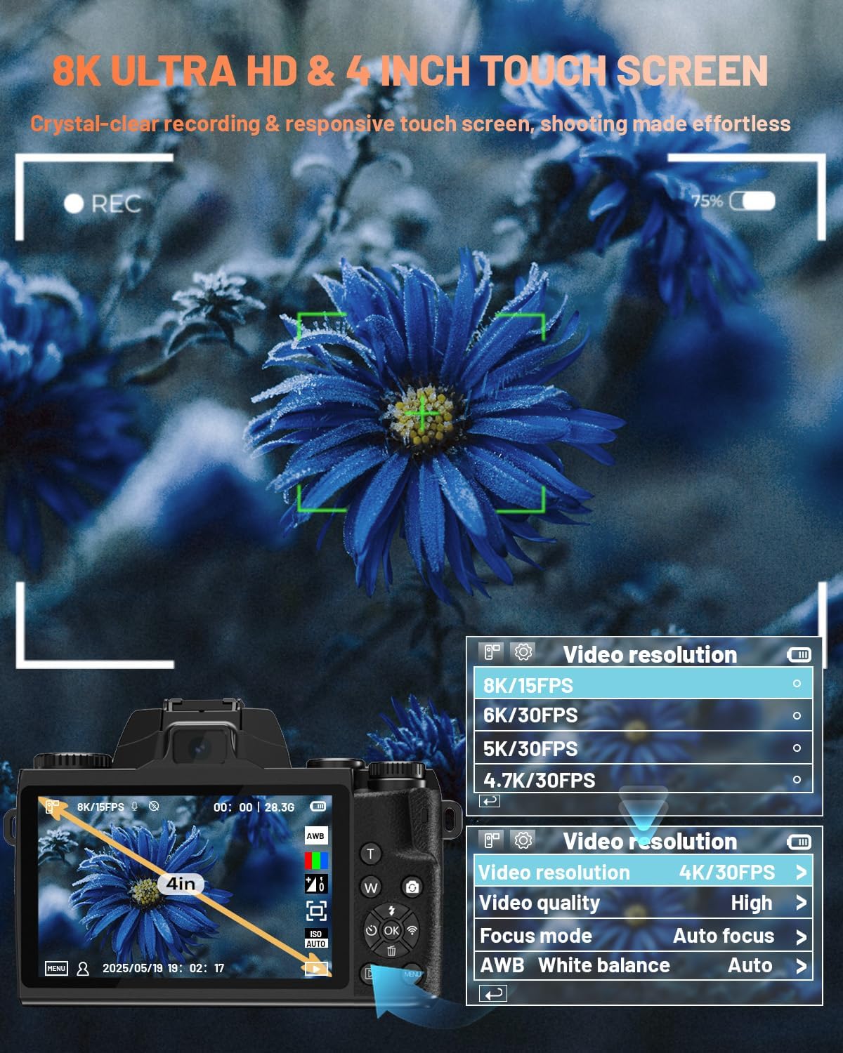 - 【8K & 64MP Cameras for Photography】This digital camera offers 8K video resolution and 64 megapixels, capturing stunning high-resolution photos and videos with fine detail. It's ideal for both high-quality photo shoots and video blogging