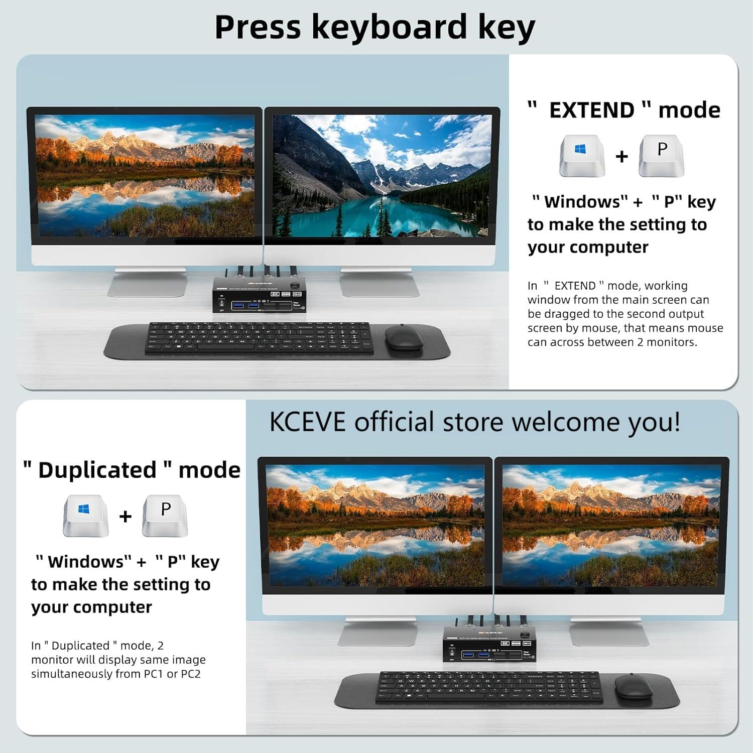 - 【HDMI + DP Port KVM Switch】This is a perfect 2 monitors KVM switch for DP and HDMI ports device to share keyboard mouse and monitor. When in copy mode the main screen can be copied to the second output screen. When in extend mode, the window from the main screen can be dragged to the second output screen.