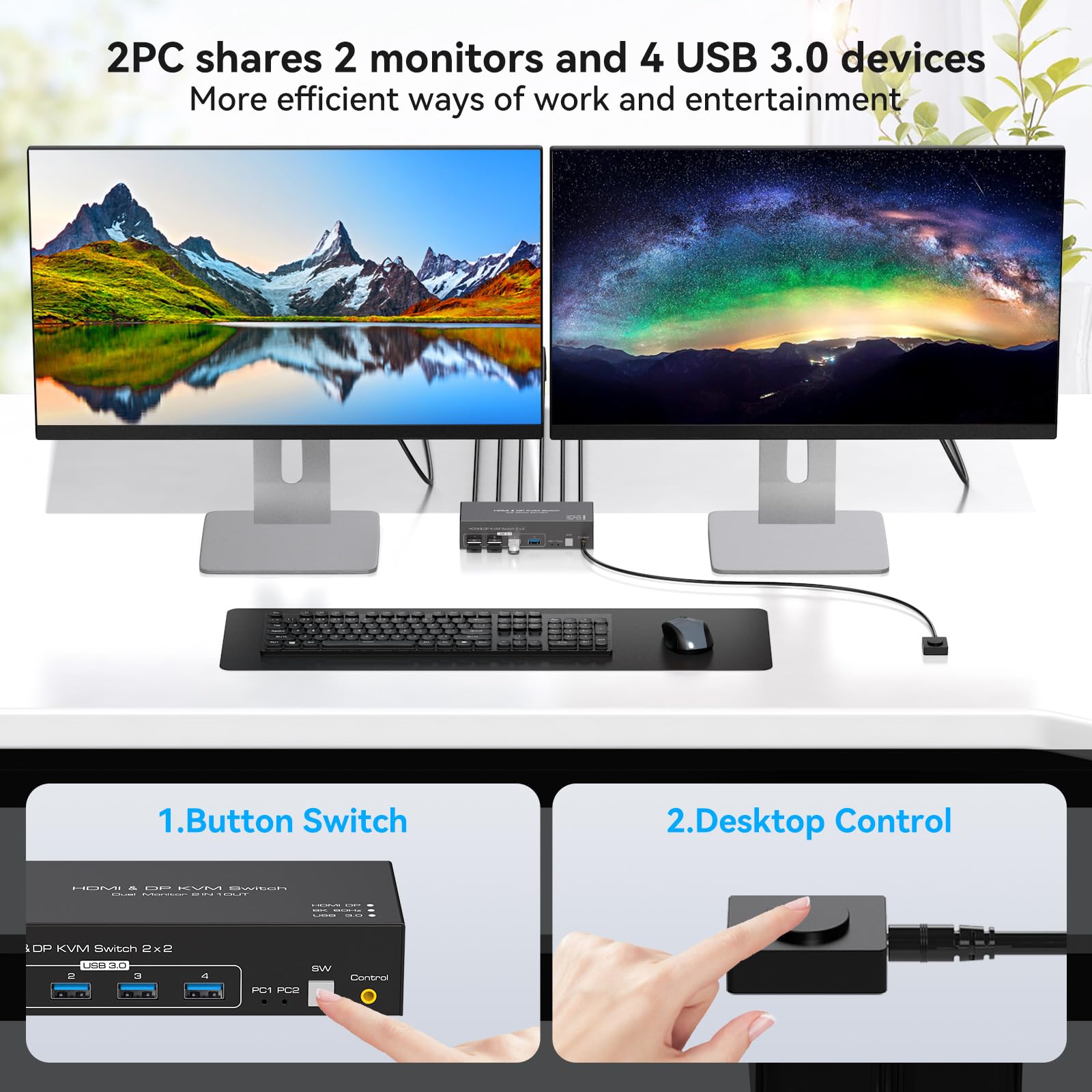- 【Two Switching Way】The displayport hdmi kvm switches supports panel button and external wire controller switching.Using the wired extension button, you can place the KVM outside the work area, making your desktop cleaner and tidier.Or just press the panel button next to the indicator light to achieve one-click switching,Simple, quick and easy to operate, Let you can save more time to do other things!NOTE: Keyboard shortcuts (hotkeys) toggles are not supported