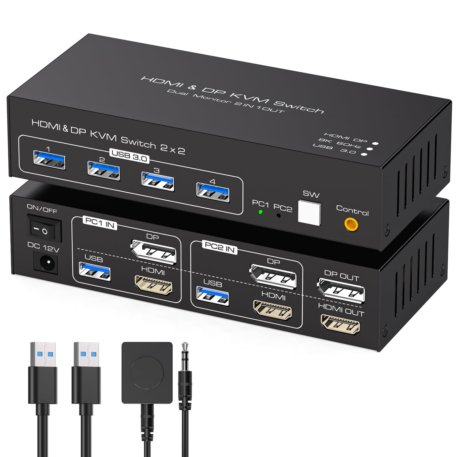 - 【KVM Switch 2 Monitors 2 Computers】The kvm switch dual monitors allows you to control two computers sharing two monitors with one set of keyboard and mouse.The kvm 2 monitors Includes DP and HDMI ports,so please make sure your computer have DP+HDMI port,and KVM don't support the signal conversion function (HDMI input can only be output to a monitor with HDMI, DP input can only be output to a monitor with DP). The DP and HDMI ports of pc1 in on the product must be connected to the same computer,pc2 ditto