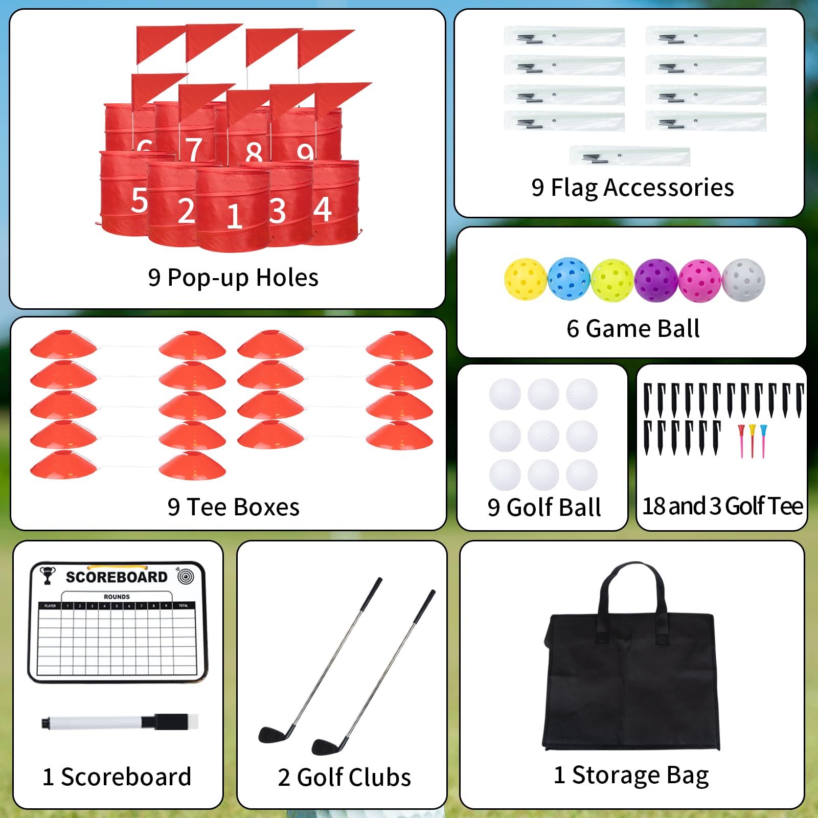 - 【Backyard Outdoor Golf Set】Set Includes: 9 collapsible buckets, 2 clubs, 9 tees and 9 flagpoles and many other accessories, you can easily start a fun game of golf, and you can also use unlimited creativity to develop different rules of the game