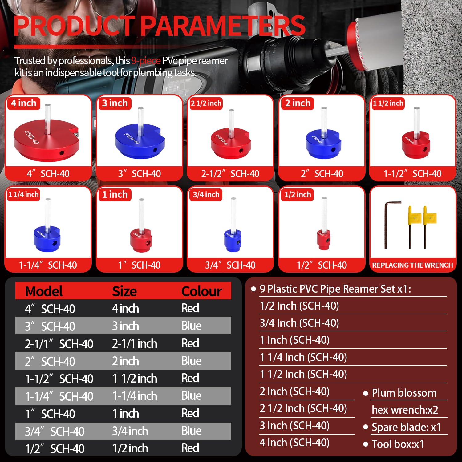 - 9PCS Complete PVC Reamer Kit: The PVC pipe reamer kit set includes 9 different sizes of aluminum PVC reamers set, including 1/2 inch, 3/4 inch, 1 inch, 1-1/4 inch, 1-1/2 inch, 2 inch, 2-1/2 inch, 3 inch, and 4 inch. It is compatible with a 1/2 inch standard reamer drill bit and comes with a hex wrench and lock knifes,make it perfect fit for various pipe diameters.