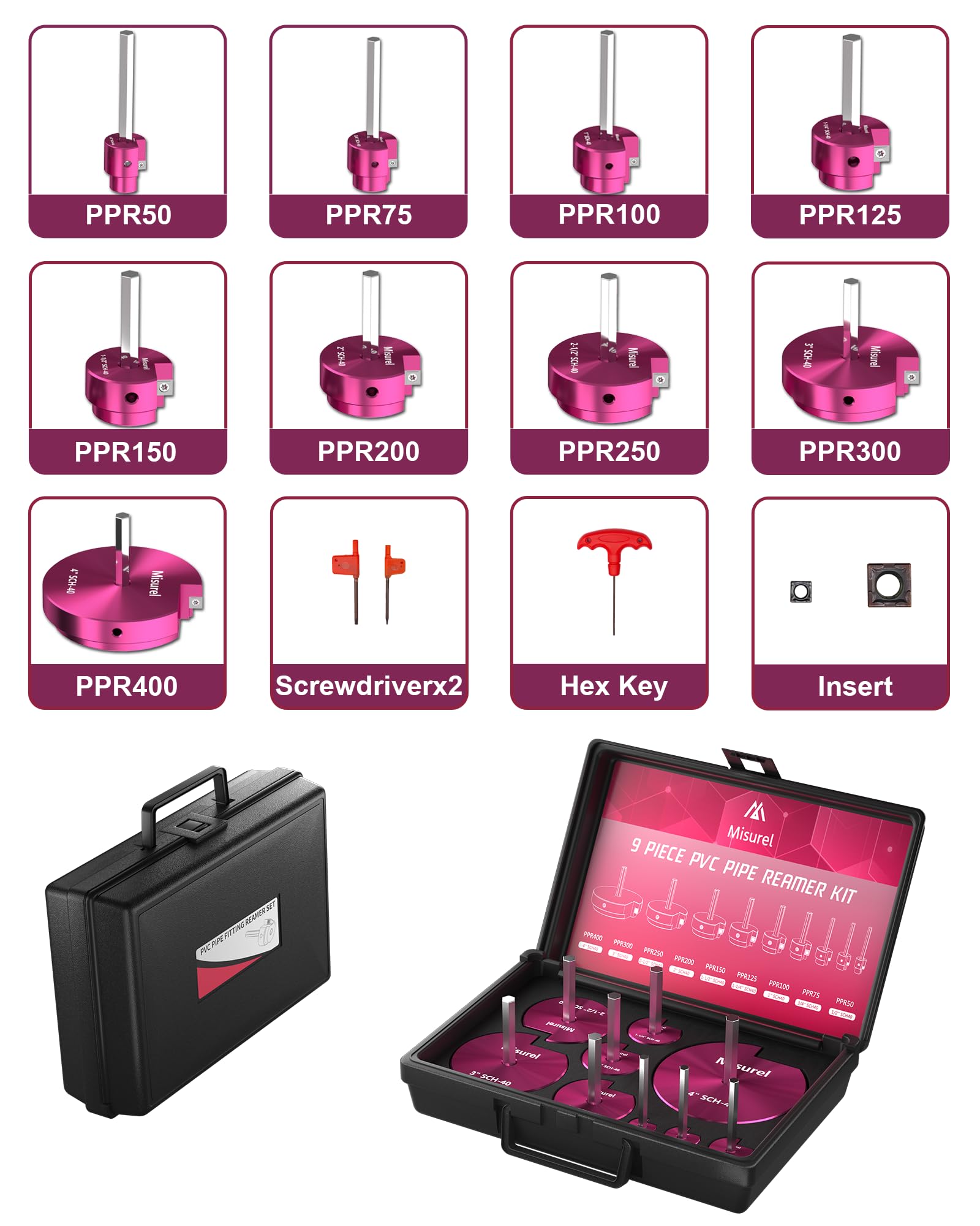 9 Pcs PVC Pipe Reamer Kit With 1/2 inch, 3/4 inch, 1 inch, 1-1/4inch, 1-1/2inch, 2inch, 2-1/2inch, 3inch, 4inch, 2 Carbide Inserts, Aluminum PVC Fitting Saver, Plumbing tools for SCH40