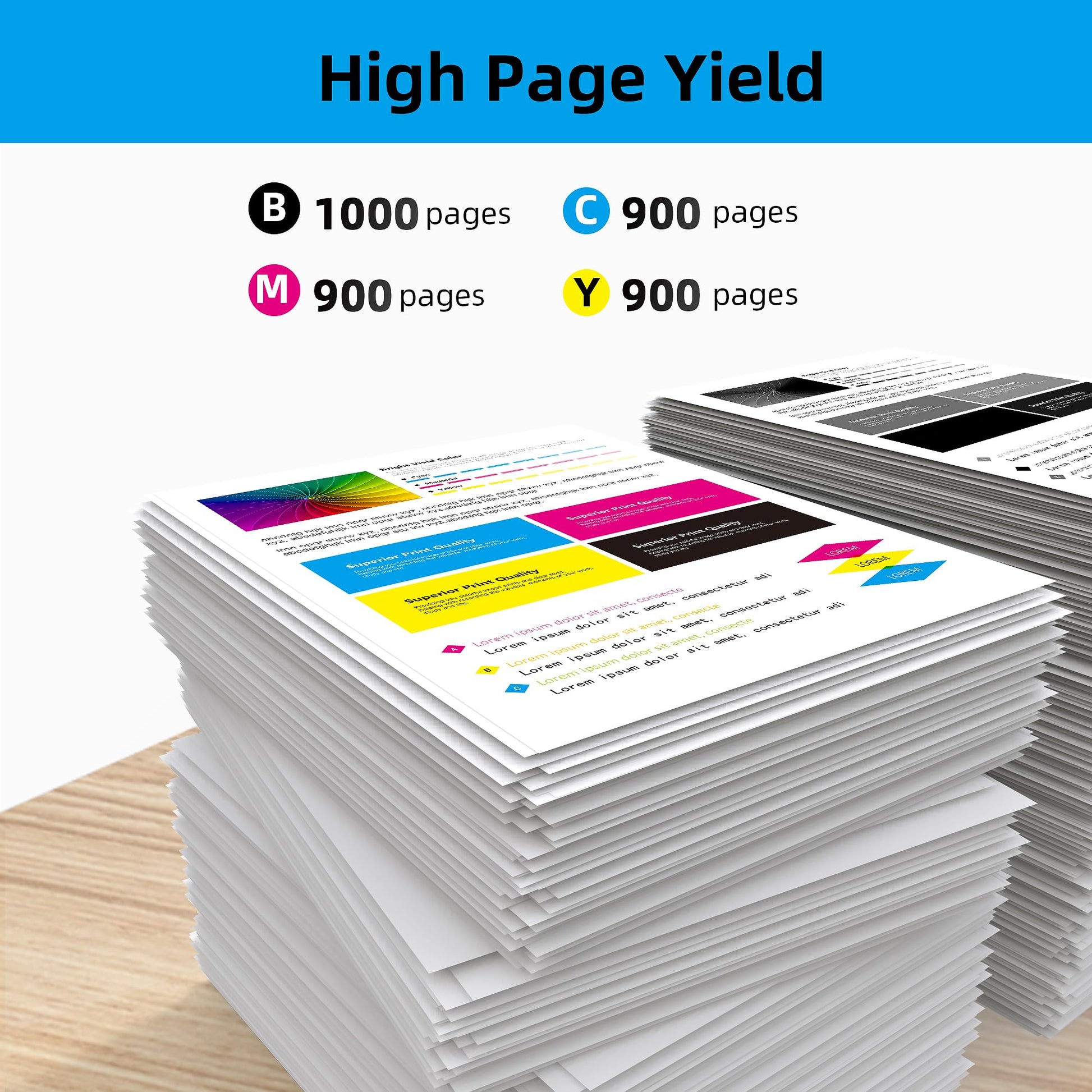 - 3X Page Yield Advantage: 1,200 pages black, 1,000 pages cyan, 1,000 pages magenta, 1,000 pages yellow (5% coverage tests show 50% less ink waste vs others)