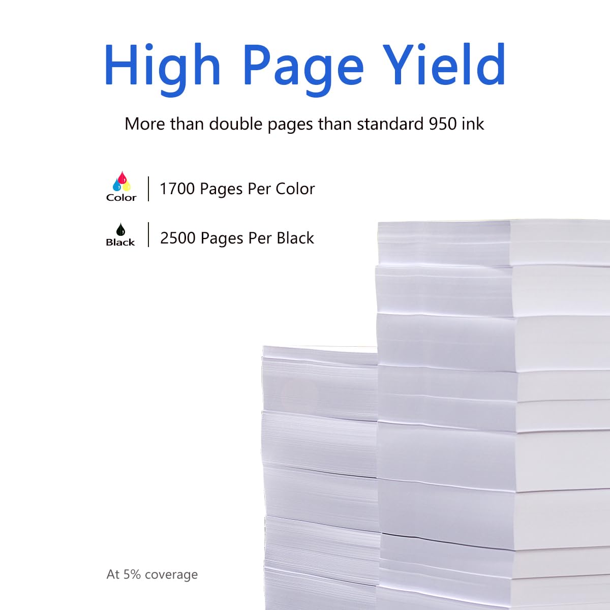 - Higher Yield: Extensive optimisation of the ink cartridge space and the use of superior sponge materials have significantly improved ink yield. Up to 2500 pages per Black 950XL, 1700 pages per Color 951XL, based on 5% coverage (Letter/A4)