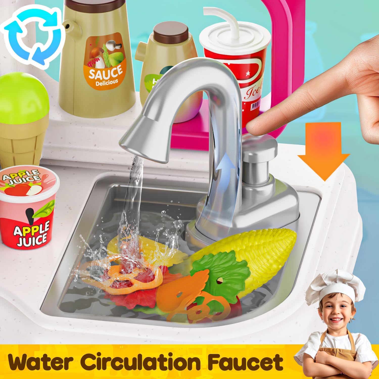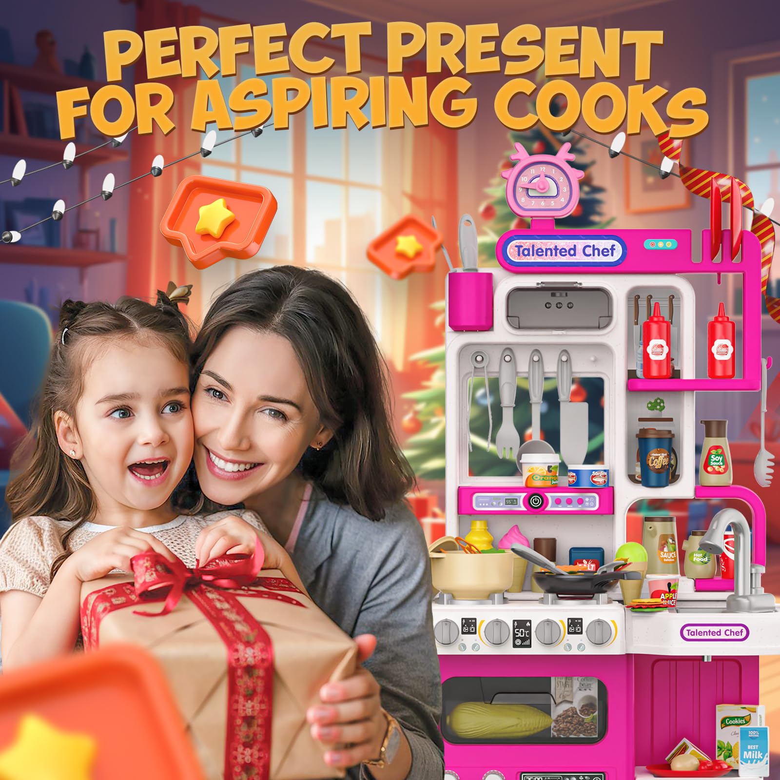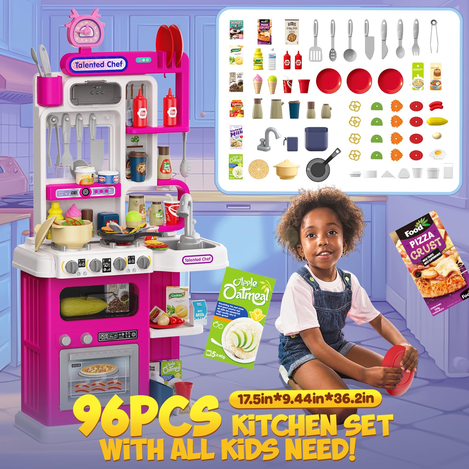 96PCS Kids Play Kitchen with Sound & Light, Cooking Stove with Steam, Play Food Toy Set for Boys and Girls (Pink)