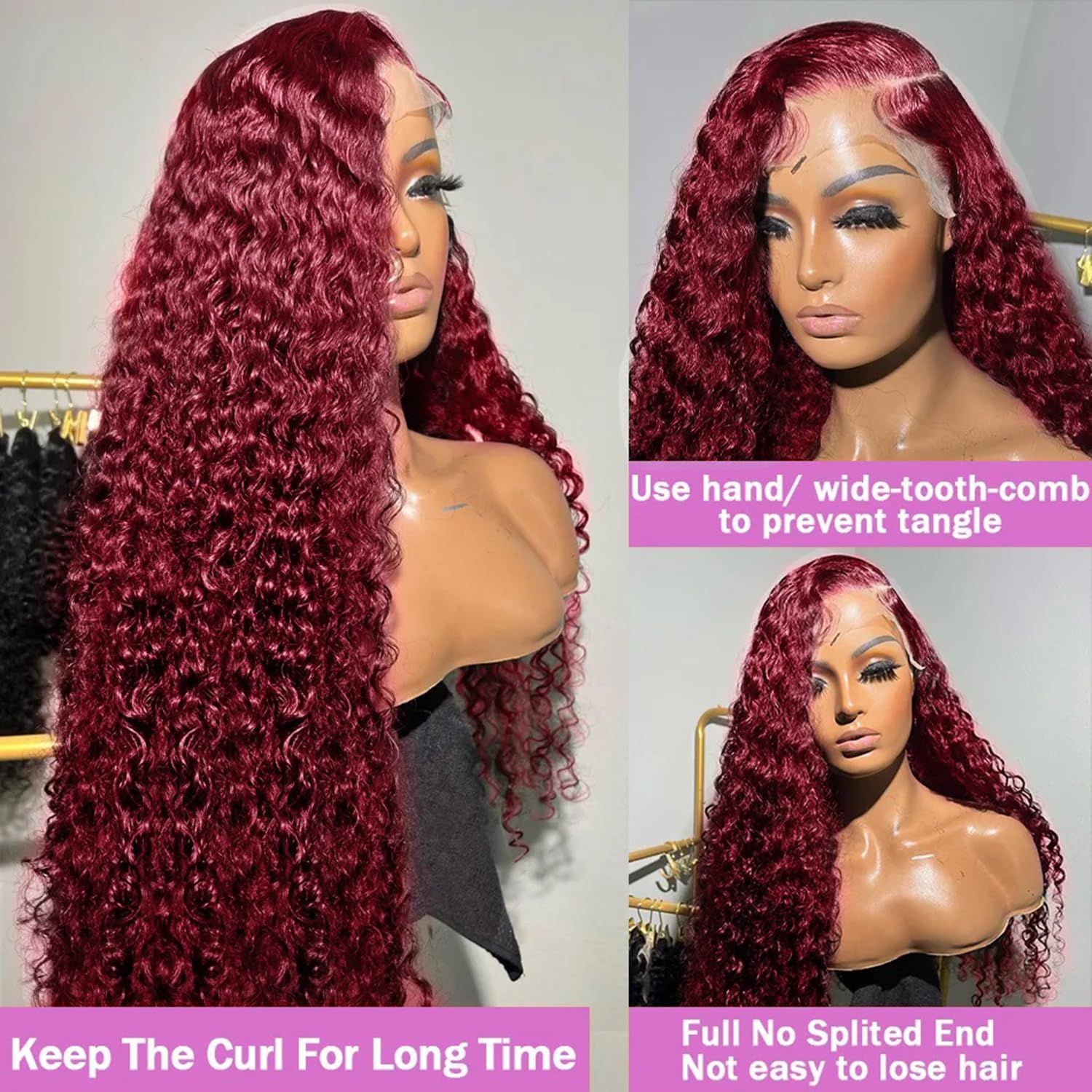 - 99j Burgundy Deep Wave Wigs Material:100% Brazilian virgin human hair lace front wigs for women,human hair cut from healthy young female hair directly;soft and natural,healthy and vibrant,comfortable against skin