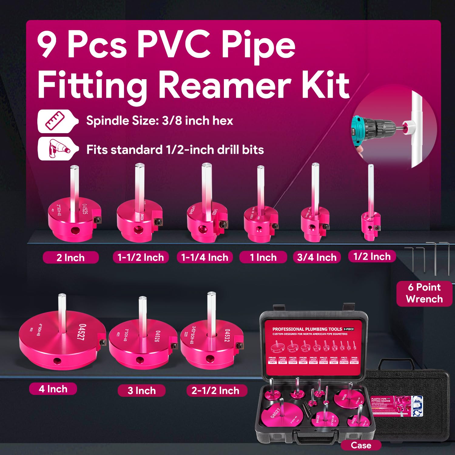 - 【Complete 9 Pcs PVC Pipe Reamer Set】 With 9 sizes ranging from small to large, includes 1/2", 3/4'', 1'', 1-1/4", 1-1/2'', 2'', 2-1/2", 3'' and 4''. Plastic Pipe Fitting Reamers fit into standard ½” drills. Shaft Size: 3/8" hex. Just take this versatile reamer kit box anywhere you go to streamline your plumbing process.
