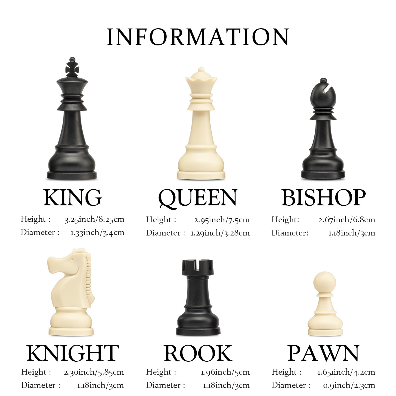 - A&A chess set includes a 15" * 15" (1.65" squares) silicone chess board, a set of staunton chess pieces: Weighted, King height 3.25" Staunton style with a zippered traveling storage bag.