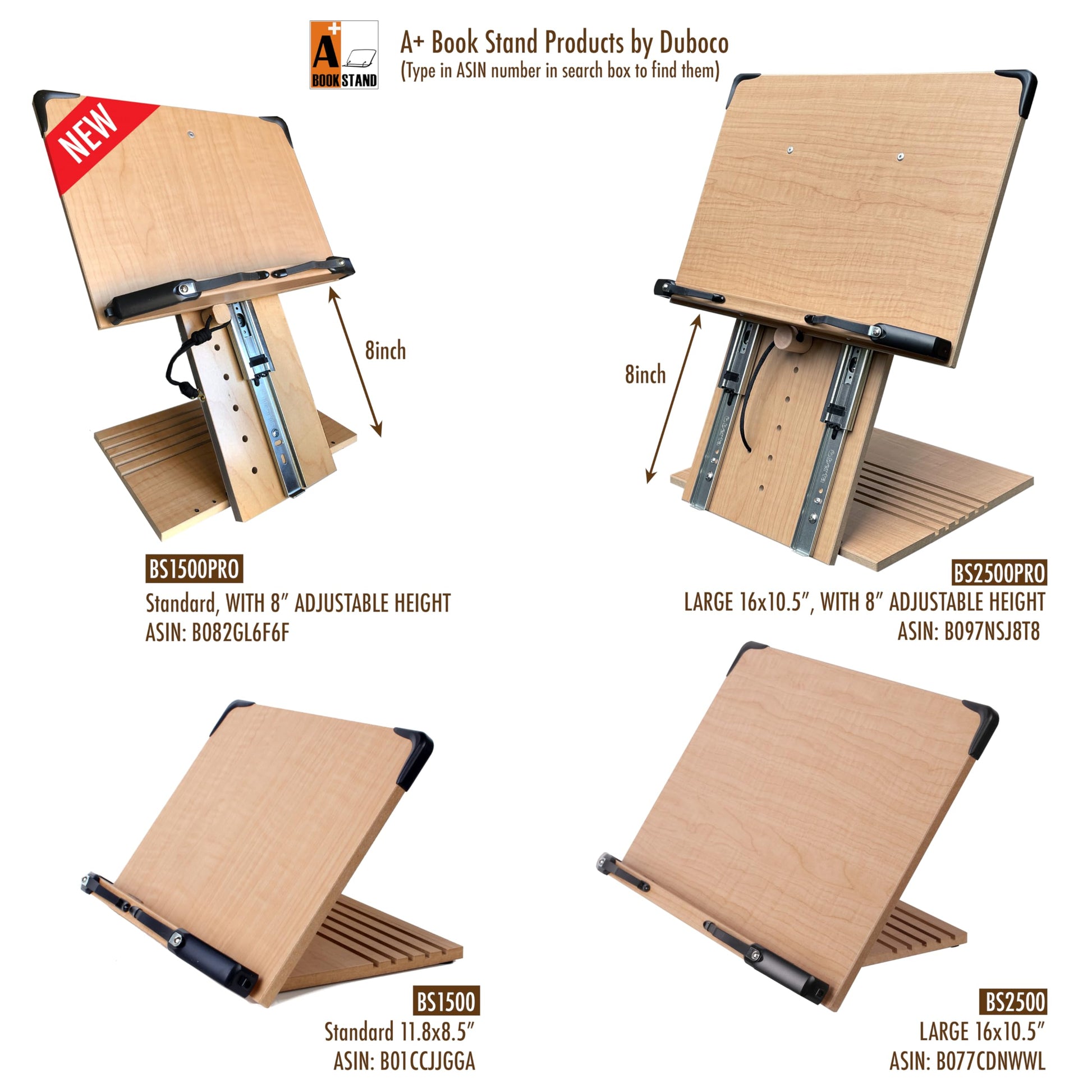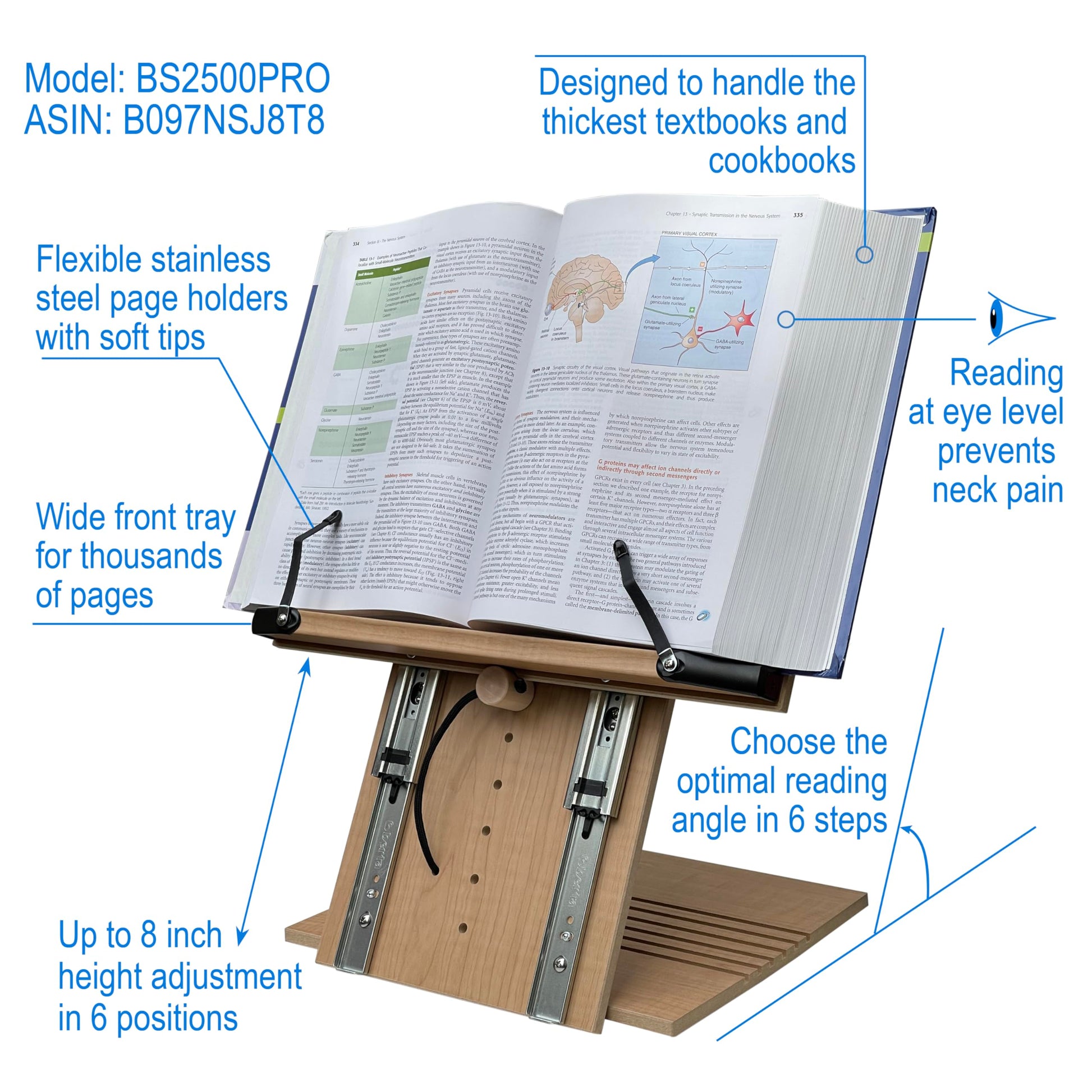 - ✅ PATENT PENDING - BOOK STAND BS2500PRO WITH 8" HEIGHT ADJUSTMENT - Easily adjustable height and angle allow for setting the book to perfect eye-Level