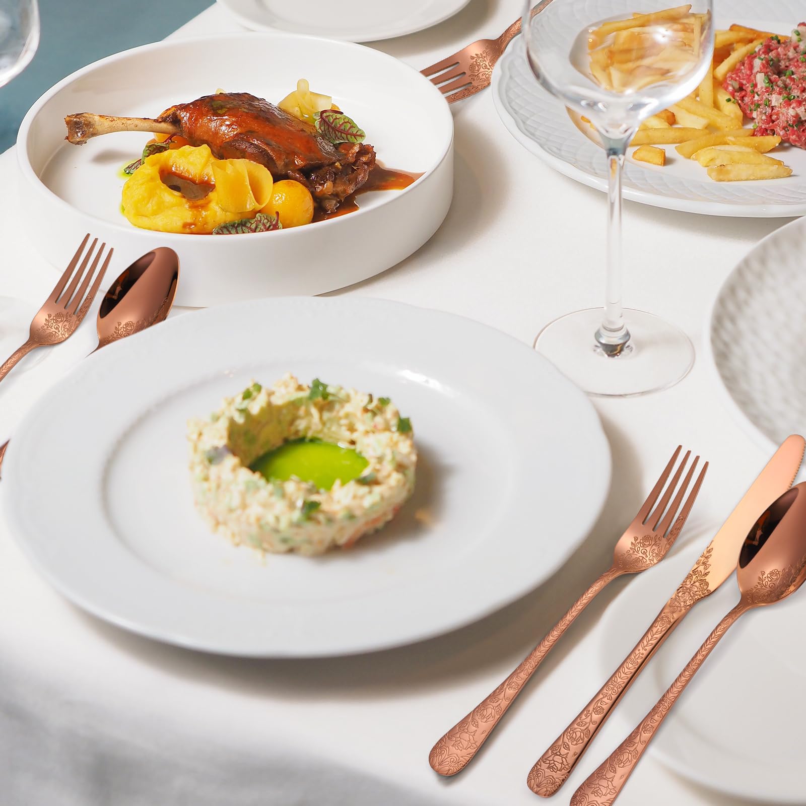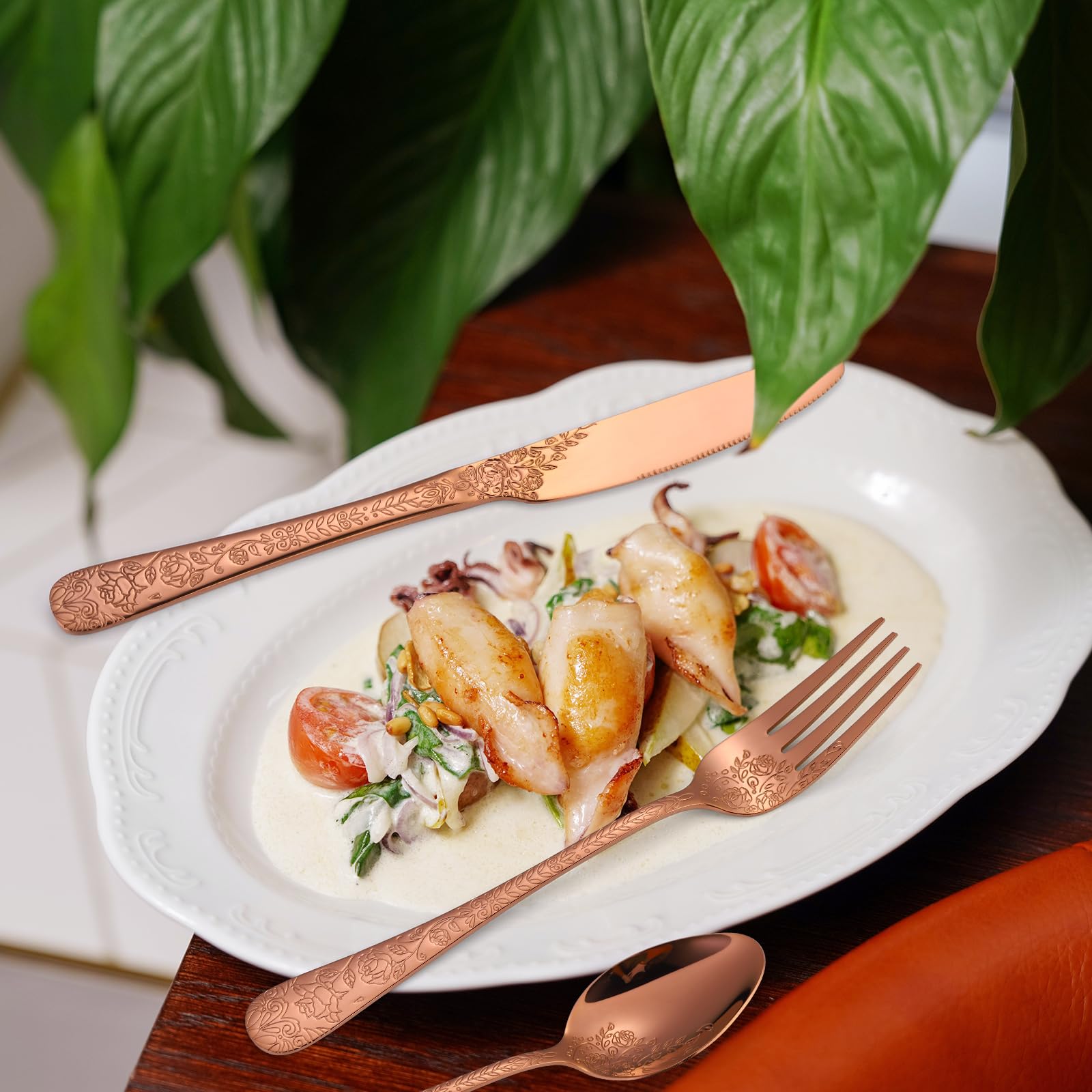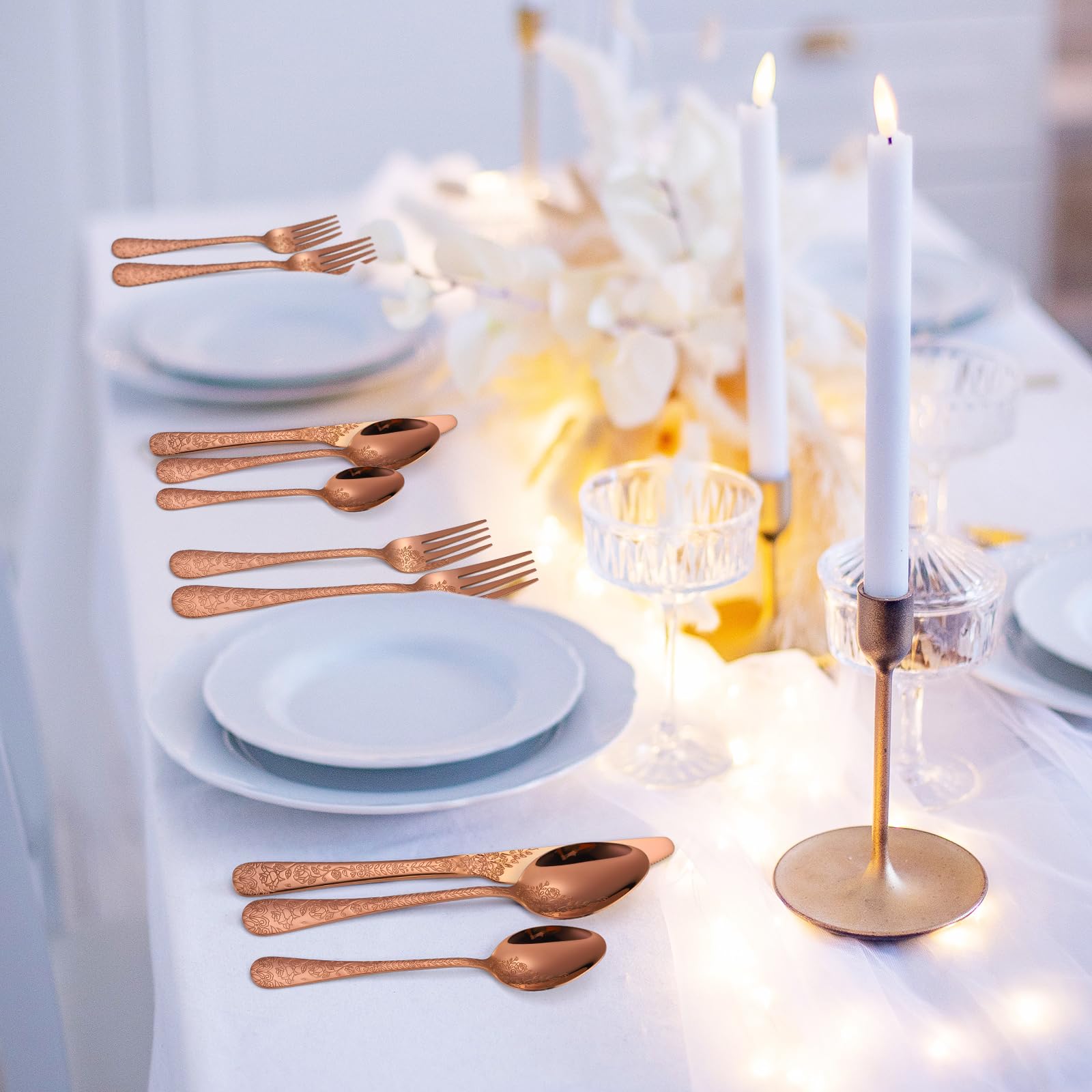 - UNIQUE: Experience the elegance of flatware sets Rose Gold/Copper Eating Utensils Vintage unique and exquisite Floral embossed design that is sure to elevate your dining experience. Crafted with quality materials, this flatware set is designed specifically for any special occasion or everyday use